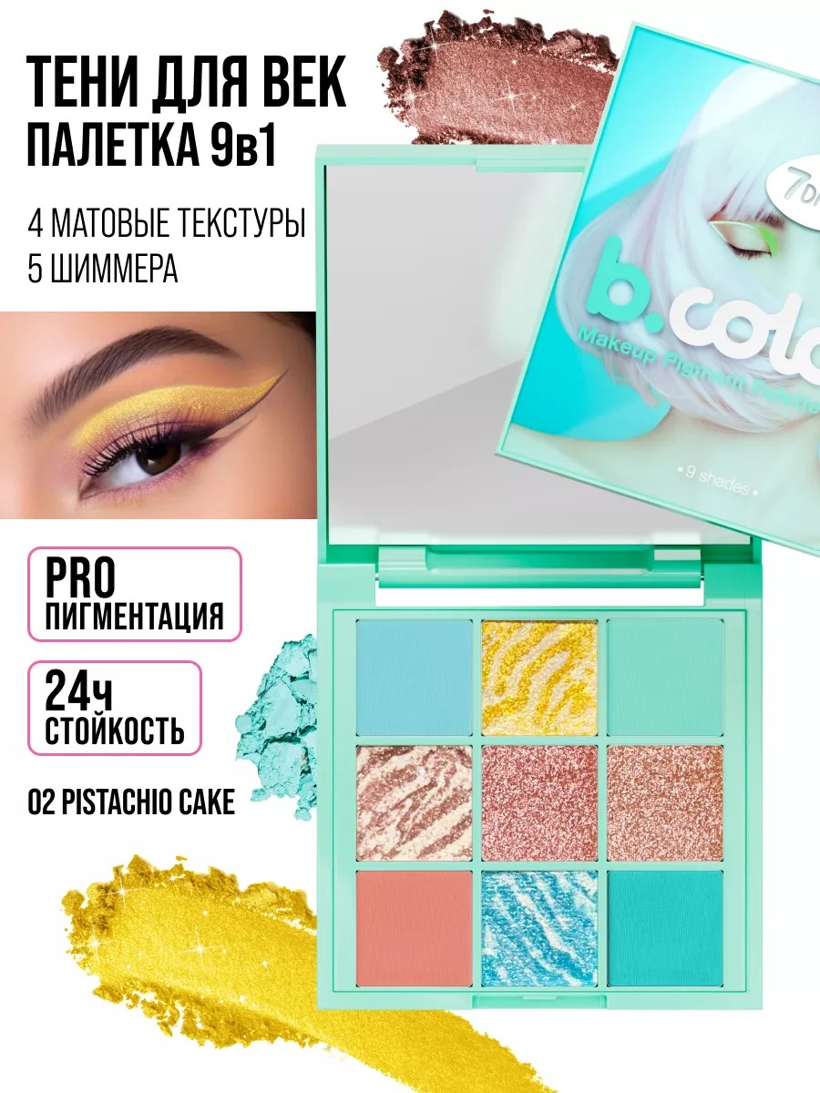 7DAYS B.COLOUR 02 PISTACHIO CAKE Eyeshadow is a professional palette of 9 unique shades and textures. This eyeshadow palette was developed by a makeup artist and harmoniously combines glitter eyeshadows with matte, nude, and vibrant shades. The highly pigmented eyeshadows blend perfectly and apply evenly, without losing color intensity throughout the day and night.