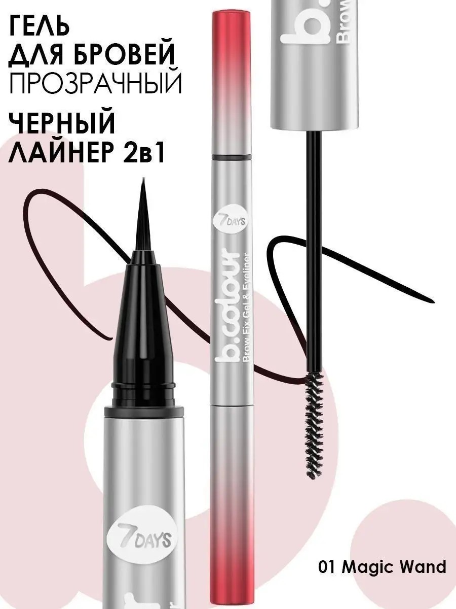 Transparent Eyebrow Gel, Black Eyeliner + 7DAYS B.COLOUR Magic Wand - the perfect express makeup! Professional 2-in-1 eyeliner: 1. Eyebrow gel styles hairs and creates brow shape. The eyebrow styler brush will make your brows perfect, giving them a well-groomed look and a brow lamination effect. 2. Felt-tip eyeliner allows you to create even eyeliner. The eyeliner creates clear, ultra-thin and wide lines, thanks to a universal brush. Felt-tip eyeliner, with a carbon black formula, guarantees a rich black shade, dense coverage, and quick drying. The eyebrow liner provides long-lasting styling for 24 hours. Application: 1. Liquid eyeliner: draw eyeliner. 2. Eyebrow styler (gel): fix and shape eyebrows. To remove, use micellar water 15243167. 7 DAYS cosmetics: eyebrow liner, styler, liquid eyeliner, gel eyeliner.