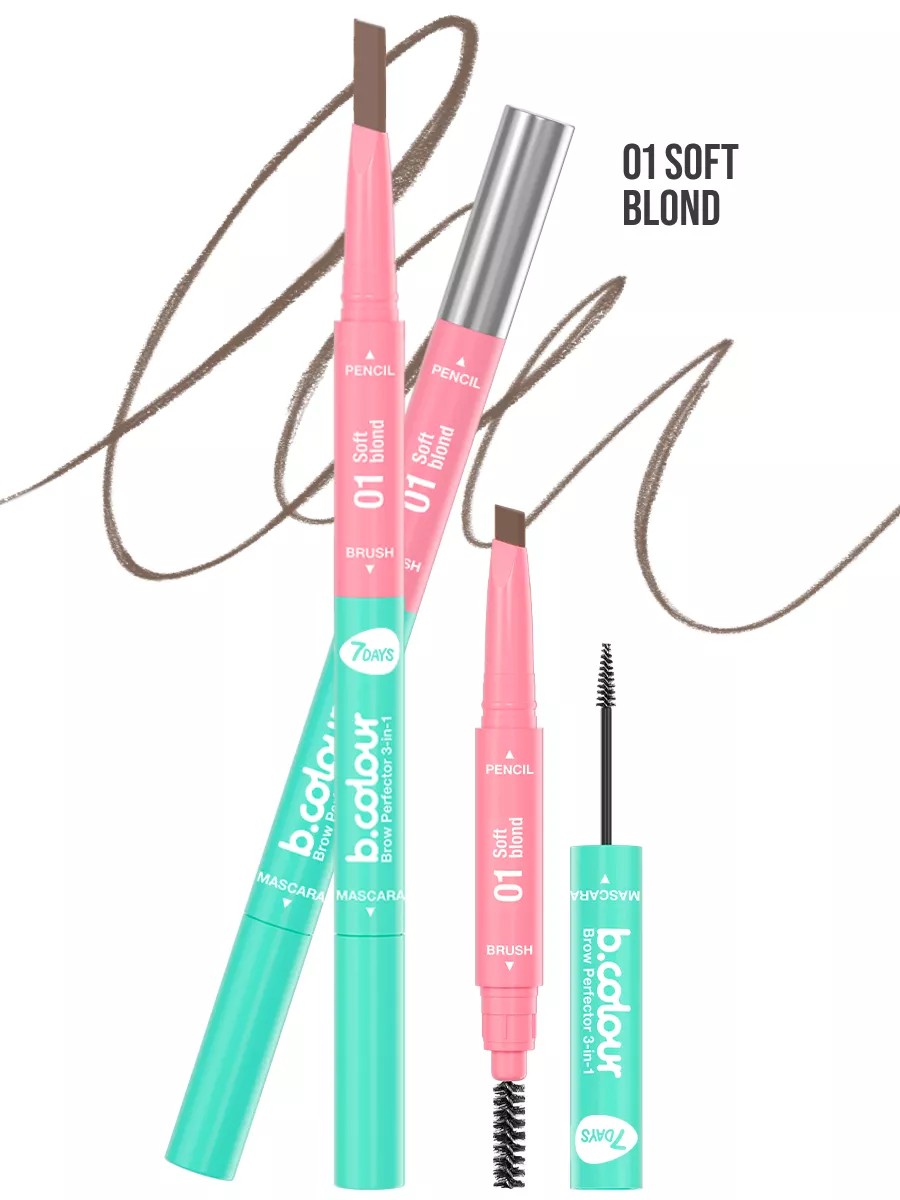 The 7DAYS B.COLOUR Brow Perfector 01 Soft Blond automatic eyebrow pencil is designed for perfect brow styling in a 3-in-1 package: a pencil, a brow brush, and a brown brow gel.