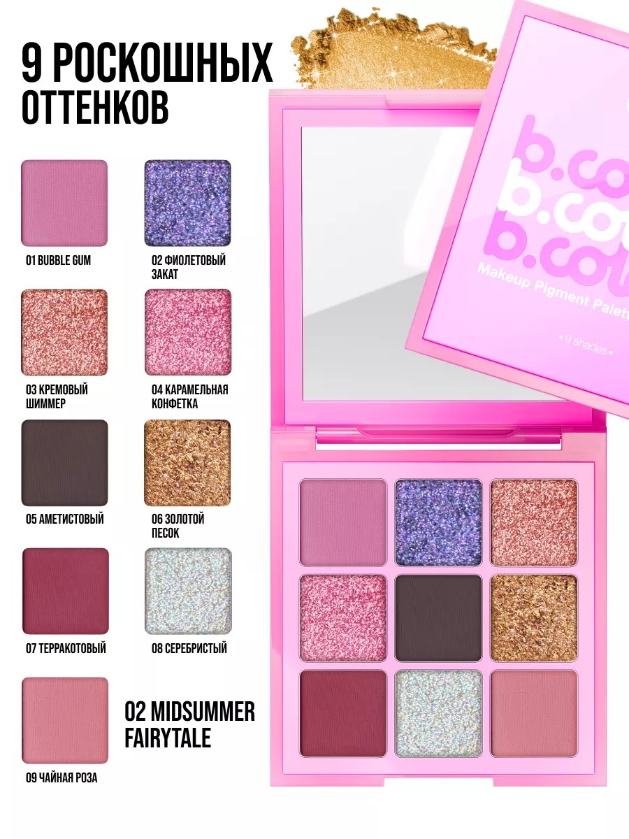 Тени для век 7DAYS b.colour - это профессиональная палитра из 9 неповторимых оттенков и текстур. Палетка теней для век разработана визажистом и гармонично сочетает в себе тени для век с блестками и матовые, нюдовые и яркие оттенки. Высокопигментированные тени для век отлично тушуются и равномерно ложатся, без скатывания и потери интенсивности цвета в течение дня и ночи. Многомерные оттенки подходят под любой цвет глаз и делают твой взгляд максимально выразительным.