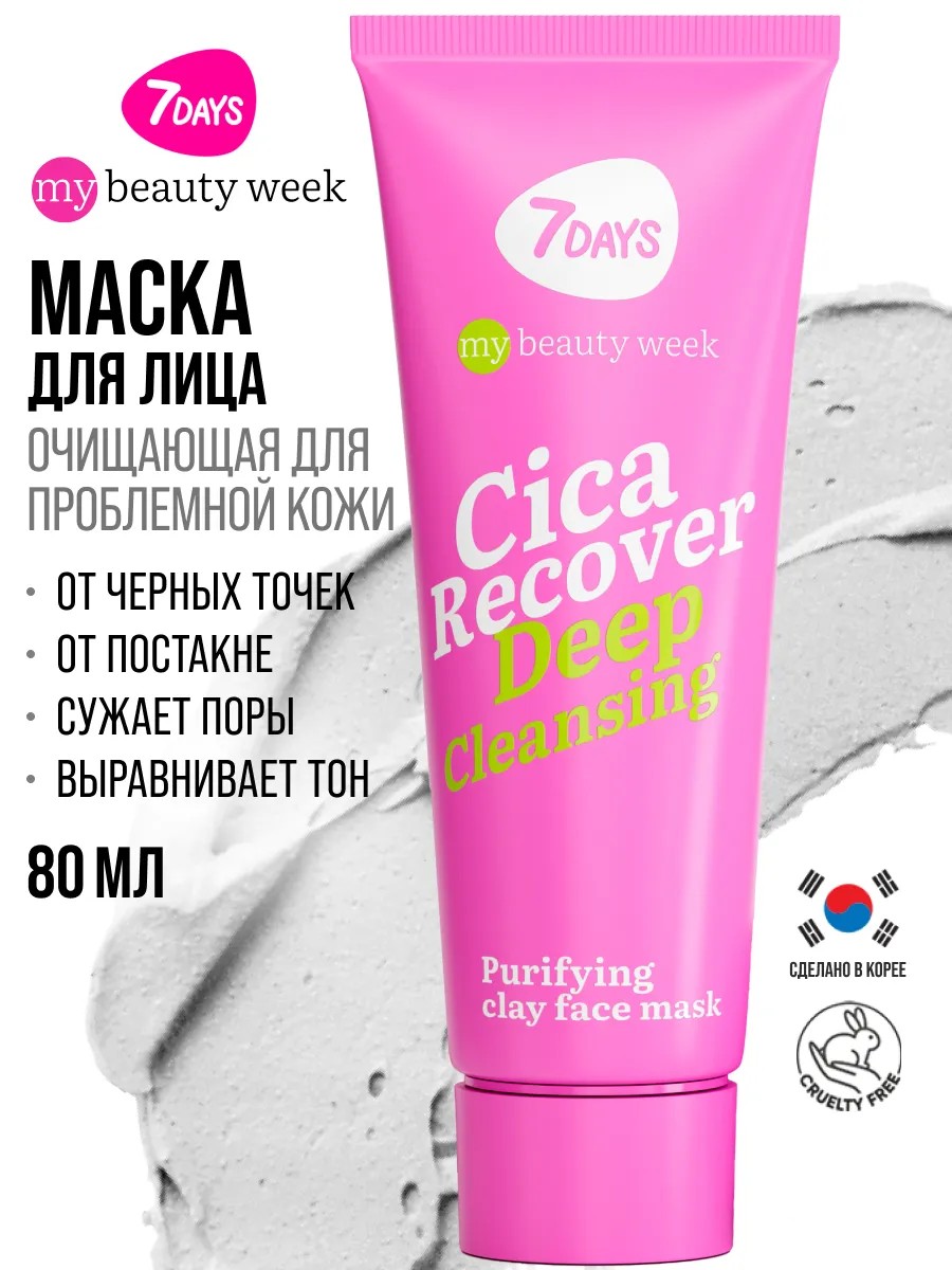 Маска для лица глиняная 7DAYS CICA RECOVER my beauty week. Очищающая маска 7DAYS средство для идеального тона и здоровья кожи. Глиняная маска для лица от прыщей и акне – моментально чистая кожа без пересушивания. Глиняная маска борется с акне и черными точками, а также уменьшает следы постакне, сужает поры, от черных точек, матирует и выравнивает тон кожи. Оказывает очищающий, антибактериальный и детокс эффект, предотвращая появление прыщей. Корейская маска для лица, предназначена для ухода в раннем возрасте, для молодой кожи 12+, проблемной и склонной к жирности. Уход за жирной и проблемной кожей. Маска для лица предназначена для всех типов кожи: улучшает состояние жирной, увлажняет сухую, улучшает внешний вид возрастной. Подходит и для подростковой и для зрелой кожи.