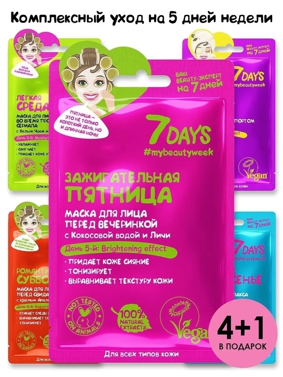 Маска для лица тканевая 7DAYS увлажняющая набор 5 шт. Уход за кожей начинается с тканевой маски для лица 7DAYS. Маски для лица тканевые набор на пять дней недели - это отличный подарок, чтобы порадовать близких и саму себя! Тканевые маски для лица с разными эффектами в зависимости от дня недели обеспечат прекрасный уход за лицом. Лекало масок из нежнейшего нетканого материала имеет удобные прорези для глаз, носа и губ. Маски для лица тканевые моментально напитывают кожу влагой и стирают признаки усталости, придавая свежий и отдохнувший вид. Особенно хорошо эффект от процедуры заметен, если хранить упаковку в холодильнике или охладить. ЛЕГКАЯ СРЕДА: Экстракт белого Чая, Гиалуроновая кислота и увлажняющий комплекс интенсивно увлажняют кожу, повышает ее упругость и эластичность, заряжая энергией молодости. Масла Ши, Макадамии и Жожоба глубоко питают, придавая мягкость и гладкость. Груша смягчает и освежает. АКТИВНЫЙ ЧЕТВЕРГ: Экстракт Пиона возвращает коже упругость и эластичность, глубоко увлажняет и смягчает. Черника усиливает барьерные свойства кожи и насыщает ее витаминами. Масла Ши, Макадамии и Жожоба глубоко питают, придавая мягкость и гладкость. ЗАЖИГАТЕЛЬНАЯ ПЯТНИЦА: Кокосовая вода глубоко восстанавливает, придает ей мягкость и бархатистость. Экстракт Личи тонизирует и придает сияние. РОМАНТИЧЕСКАЯ СУББОТА: Красный Апельсин повышает тургор кожи и увлажняет. Способствует восстановлению здорового цвета лица и выведению токсинов. Папайя прекрасно увлажняет и тонизирует.