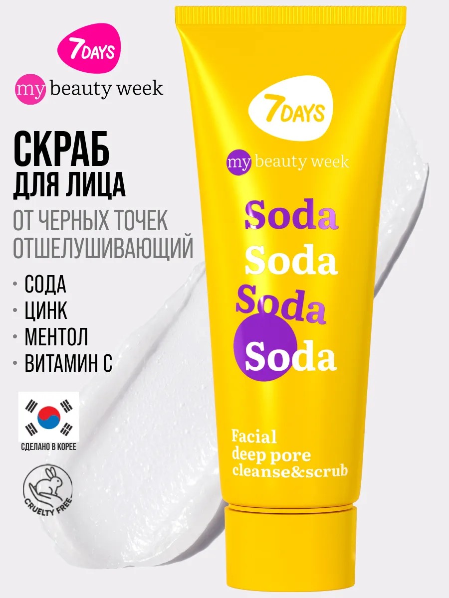 Корейская косметика 7DAYS- твой инновационный уход за кожей лица, красота и молодость 24/7. SMART - уход MY BEAUTY WEEK – это тщательно подобранное сочетание «умных» ингредиентов и высокая концентрация активных компонентов для 100% эффективности. Скраб для лица очищающий 7days SODA матирует, очищает поры, устраняет черные точки, выравнивает тон и текстуру кожи. Активные компоненты: Центелла Азиатская увлажняет, борется с несовершенствами, восстанавливает и успокаивает кожу, мельчайшие частицы Соды бережно отшелушивают ороговевшие клетки, не травмируя кожу, способствуют обновлению, осветлению и улучшению цвета лица. Корейский скраб для лица подходит для всех типов кожи, даже для чувствительной, для всесезонного использования. Скраб для лица с цинком, витамином C и ментолом глубоко очищает кожу от загрязнений, обновляет и убирает жирный блеск. Мельчайшие частицы соды бережно отшелушивают ороговевшие клетки, не травмируя ее. Содовый скраб матирует, обеспечивает сужение пор, сокращает черные точки, выравнивает тон и текстуру кожи. Витамин C оказывает противовосполительное действие, улучшает цвет лица, борется с постакне, возвращает коже здоровое сияние. Цинк оказывает антибактериальное действие, матирует, убирает шелушения и покраснения, устраняет прыщи и подсушивает воспаления. Ментол тонизирует кожу, выводит токсины, дарит ощущение прохлады, успокаивает. Скраб предназначен для всех типов кожи: улучшает состояние жирной, увлажняет сухую, улучшает внешний вид возрастной. Подходит для всесезонного использования, не тестируется на животных. Применение: распредели скраб по очищенной коже лица, избегая область вокруг глаз, помассируй 2-3 минуты, уделяя особое внимание проблемным зонам, тщательно смой теплой водой. Может использоваться в качестве подарка. Скраб для лица с содой и скраб для лица от прыщей. Скраб для лица мужской и скраб для лица для жирной кожи.