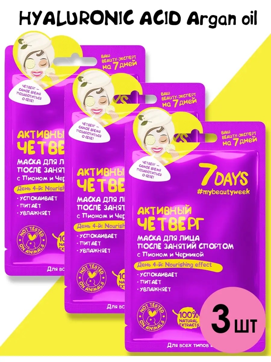 Ежедневный уход за кожей с тканевой маской для лица 7DAYS АКТИВНЫЙ ЧЕТВЕРГ. Это деликатное увлажнение, восстановление и питание для любого типа кожи. Инновационный комплекс в составе выполняет 7 важных функций: увлажнение, питание, повышение упругости и эластичности, восстановление, насыщение витаминами, смягчение, придание гладкости. Действует как компресс, увлажняющий глубокие слои кожи, снимает следы усталости. Сыворотка в составе мгновенно увлажняет кожу и дарит ощущение комфорта, как после массажа. Экстракты пиона, черники, комплекс масел (Ши, Жожоба), гиалуроновая кислота - основные действующие компоненты маски для лица. Маска для лица - это отличный подарок на такие праздники, как День рождения, Новый год, 8 марта, День Святого Валентина, День учителя и без повода. Увлажненная кожа, молодость и красота - тканевые маски 7DAYS.