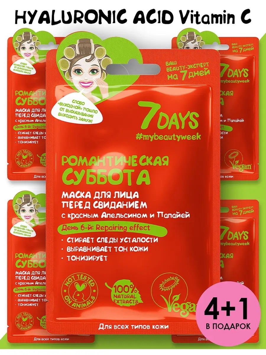 Маска для лица тканевая 7DAYS увлажняющая набор 5 шт. Уход за кожей начинается с тканевой маски для лица 7DAYS РОМАНТИЧЕСКАЯ СУББОТА. Это деликатное увлажнение, восстановление и питание для любого типа кожи. Инновационный комплекс в составе выполняет 7 важных функций: увлажнение, питание, тонизирование, повышение упругости и эластичности, придание сияния, выравнивание текстуры и тона кожи, восстановление. Действует как компресс, увлажняющий глубокие слои кожи, снимает следы усталости, дарит коже здоровый и отдохнувший вид. Сыворотка в составе мгновенно увлажняет кожу и дарит ощущение комфорта, как после массажа. Маски для лица набор 7DAYS на пять дней недели - это отличный подарок, чтобы порадовать близких и саму себя! Тканевые маски для лица с разными эффектами в зависимости от дня недели обеспечат прекрасный уход за лицом и внесут в повседневность ярких красок и уникальных впечатлений. Лекало масок из нежнейшего нетканого материала имеет удобные прорези для глаз, носа и губ, поэтому удовольствие от бьюти-процедуры не будет омрачено некрасивыми сборками и заломами на лице. Маски для лица тканевые моментально напитывают кожу влагой и стирают признаки усталости, придавая свежий и отдохнувший вид. Особенно хорошо эффект от процедуры заметен, если хранить упаковку в холодильнике или предварительно ее охладить. Экстракт красного апельсина, папайи, сахарного тростника, оливковое масло - основные действующие компоненты маски для лица. Профессиональная уходовая косметика для лица— оригинальный подарочный набор для женщин: от мамы и подруги, до коллеги или сестры. Незабываемые бьюти боксы: в подарок девочке подростку или дочке — косметика для макияжа или для ухода за собой. Стильный бокс с косметикой — отличный подарочный набор подруге или девушке на День Рождения.