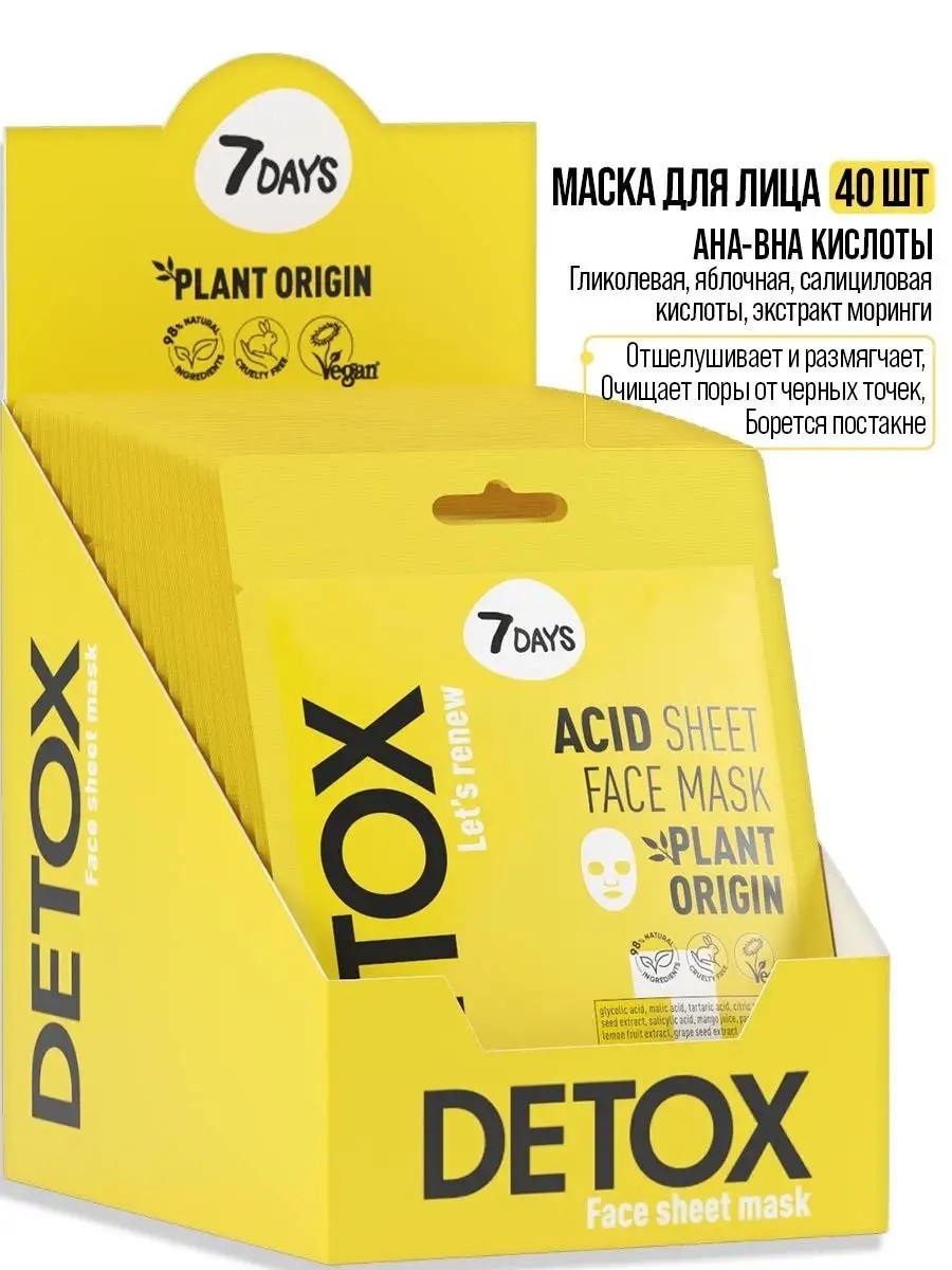 Маска для лица тканевая 7DAYS DETOX Маски для лица тканевые набор 40 шт. Профессиональное уходовое средство для лица.