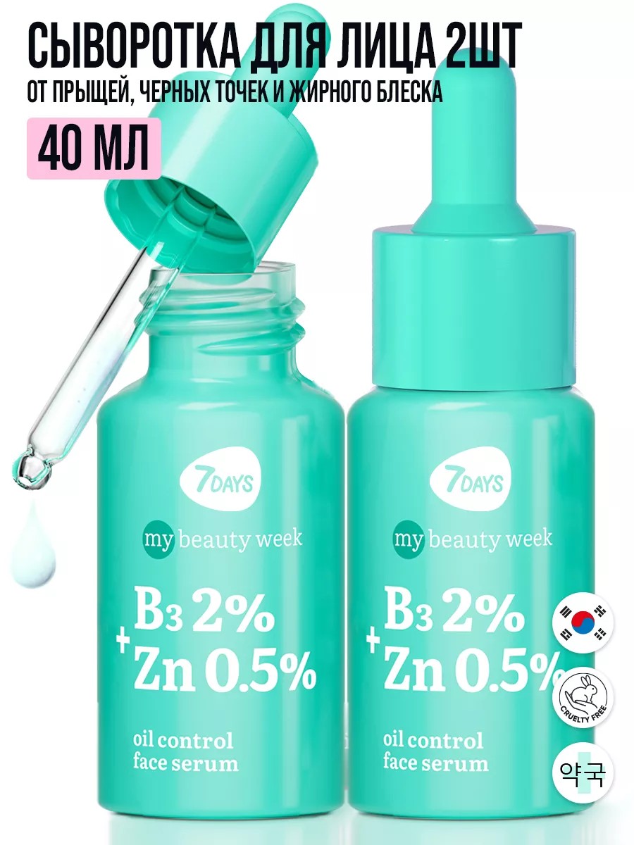Сыворотка для лица B3+Zn 7DAYS MY BEAUTY WEEK Сыворотка с Ниацинамидом 2% и Цинком 0,5% - уход за жирной и проблемной кожей. Набор 2 штуки 40ml. Сыворотка для лица от прыщей, от черных точек, от акне и постакне – моментально чистая кожа без липкости, ощущения пленки и стянутости, борьба с несовершенствами кожи. Предназначена и хорошо работает и на нежной молодой коже 12+, для проблемной кожи лица и склонной к жирности, убирает покраснения, уменьшает количество прыщей, а также подходит и для возрастной кожи лица для женщин и для мужчин.