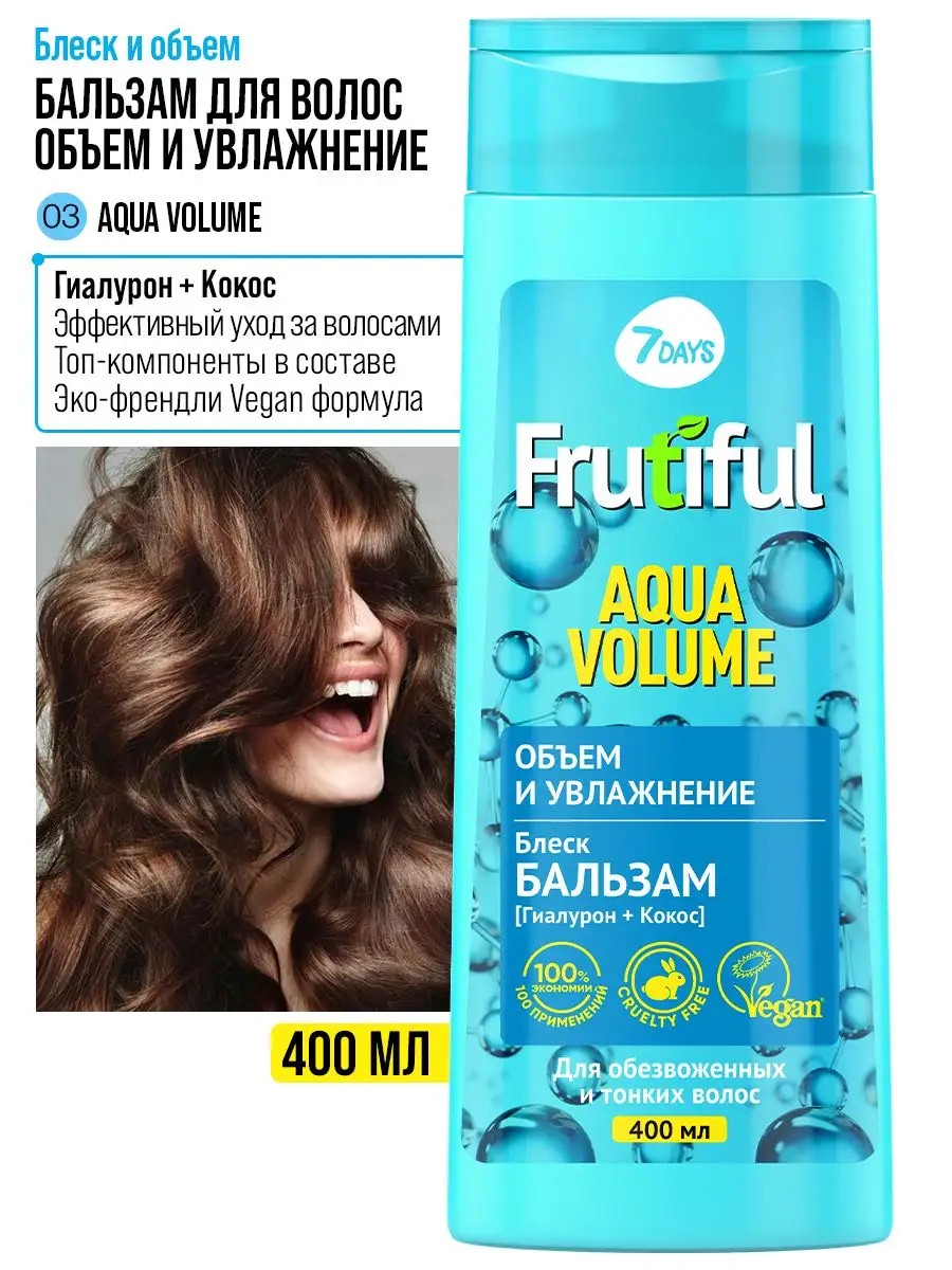 КОМПЛЕКС ДЛЯ МАКСИМАЛЬНОГО РЕЗУЛЬТАТА: Шампунь + Бальзам FRUTIFUL AQUA VOLUME* Подтверждено результатами тестирования, проведенного на базе респондентов из 50 женщин.