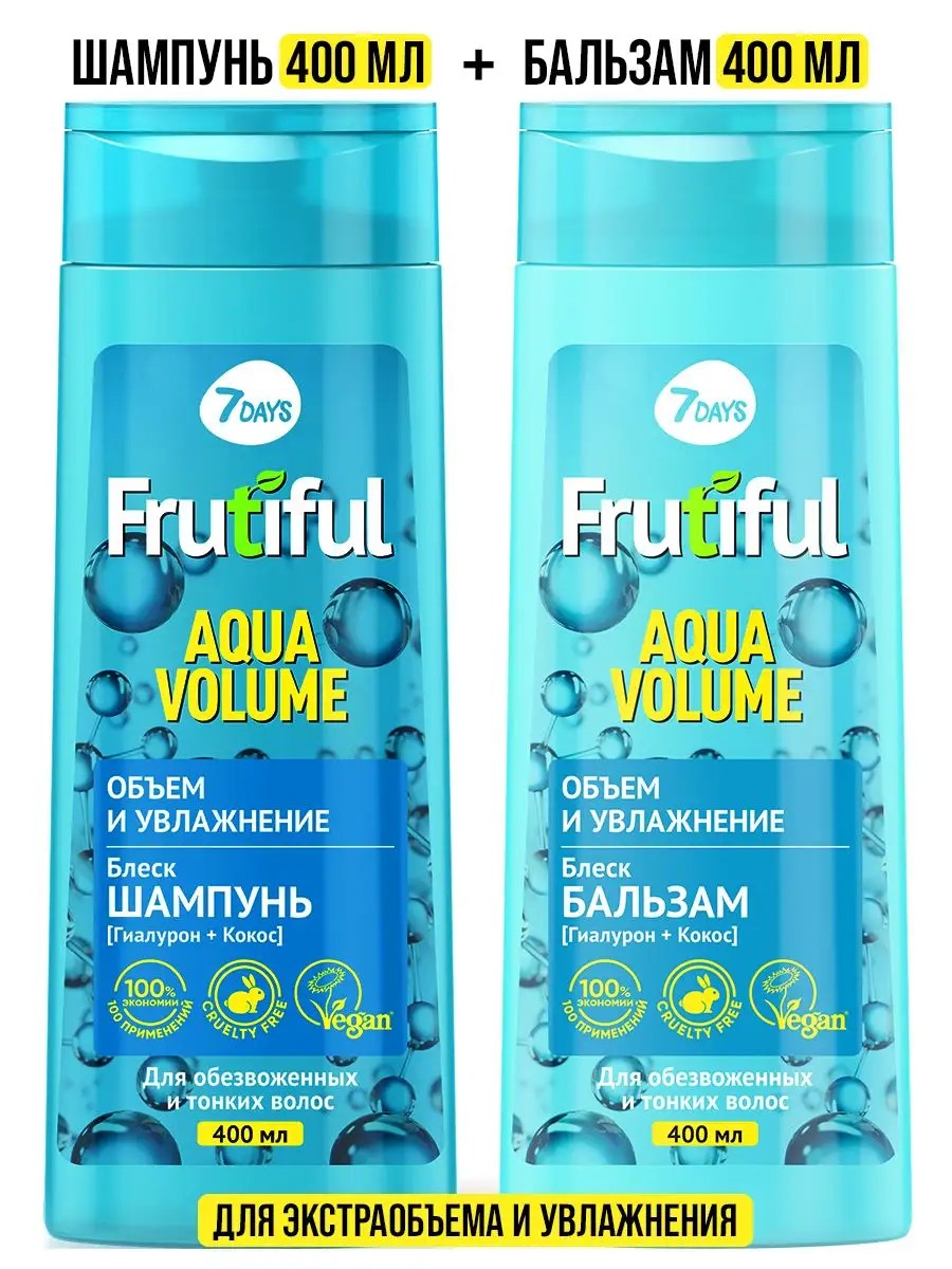 | Полное наименование товара | Набор шампунь и бальзам для волос 7DAYS FRUTIFUL Aqua Volume, с гиалуроновой кислотой и маслом кокоса, для тонких и обезвоженных волос питание и блеск, облегчение расчесывания и антистатический эффект, для всех типов волос для ежедневного применения, веганский, объем 2×400 мл. |