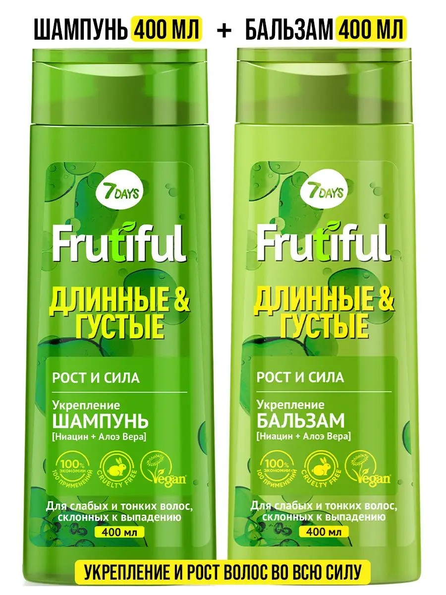 Набор шампунь и бальзам для волос 7DAYS FRUTIFUL Длинные и Густые. Комплексный уход для красоты и здоровья волос. Шампунь для волос 400 мл и бальзам для волос 400 мл. Шампунь Профессиональный бережно и эффективно очищает, симулирует рост волос, при этом сохраняя легкость и объем у корней. Не утяжелен силиконами. Содержит мягкую формулу ПАВ компонентов. Ускорение роста и укрепление, восстановление даже самых слабых и тонких волос. Шампунь для волос женский подходит для ежедневного применения, не пересушивая и интенсивно ухаживая за волосами и кожей головы. Сокращают выпадение волос и помогают быстро отрастить длину мечты благодаря профессиональной формуле, насыщенной компонентами: Ниацин (Витамин В3) укрепляет, стимулирует регенерацию фолликулов и ускоряет рост волос. Алоэ Вера увлажняет, восстанавливает, защищает кончики от сухости и сечения, обеспечивая гладкость и легкое расчесывание волос. Волосы приобретают здоровый блеск, становятся легкими в укладке, выглядят ухоженными. Сбалансированный pH подходит как для женщин, так и для мужчин и для подростков мальчиков и девочек.