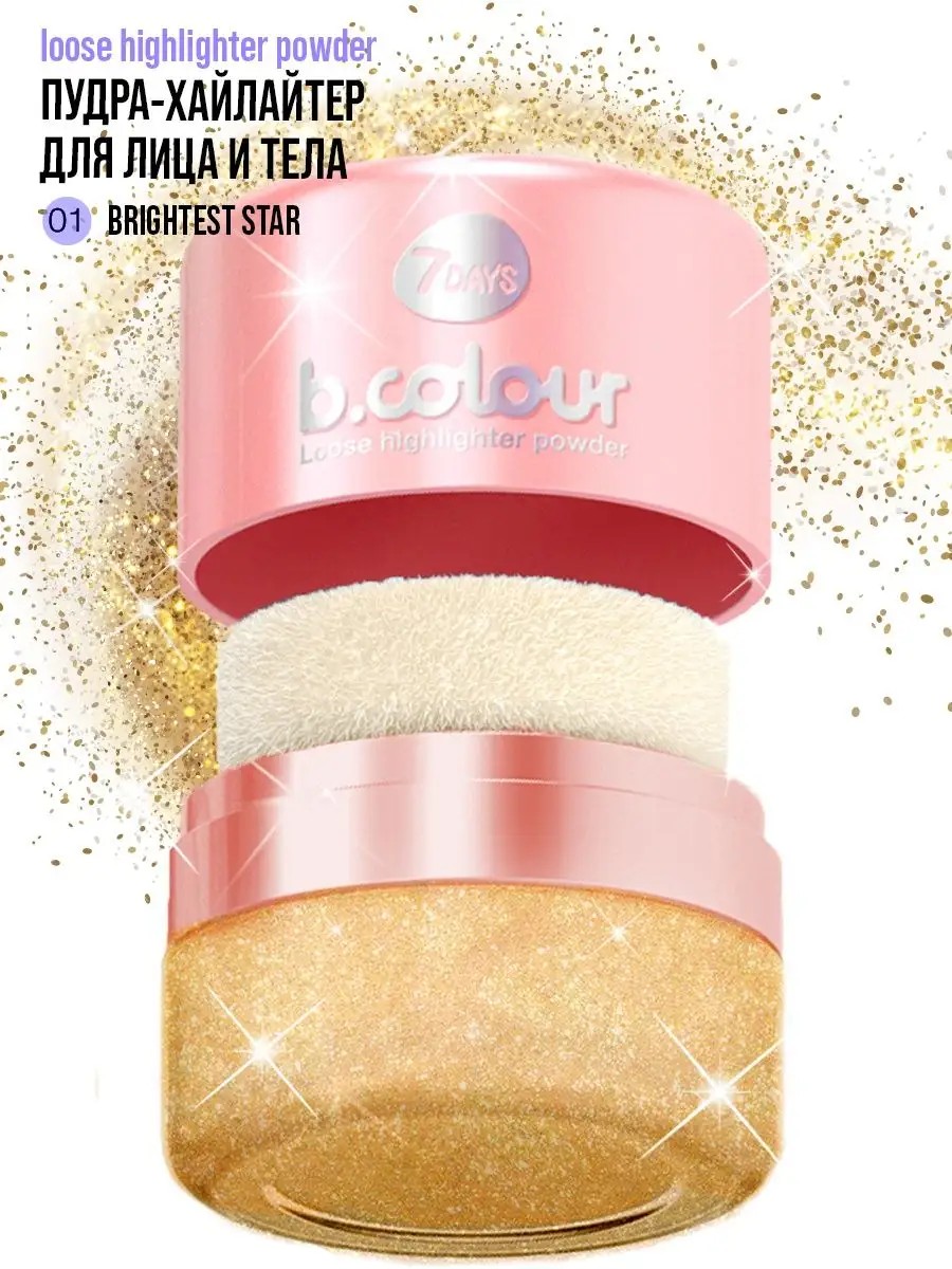 The 7 DAYS B.COLOUR Face Highlighter is a professional 3-in-1 radiance: highlighter, shimmering face powder, and compact eyeshadow. 1. The face highlighter imparts a luxurious glow thanks to millions of shimmering particles, while the face glitter creates a rested and fresh look. The body highlighter shimmers weightlessly on the collarbones, creating a subtle tan, while the face glitter accentuates it. The body and face glitters blend seamlessly. 2. The face powder will become your shimmering favorite, visually evening out skin tone and texture. 3. The glitter eyeshadow is convenient to take with you for an express makeup look. You can safely forget about constantly losing makeup sponges, because it's built into the lid, and it evens out with a mirror! Makeup sponges ensure economical use. Application: 1. Highlighter for body and face: blend over cheekbones, eyebrows, lips, and collarbones. 2. Bronze glitter for body: create a luxurious glow. 7 DAYS cosmetics