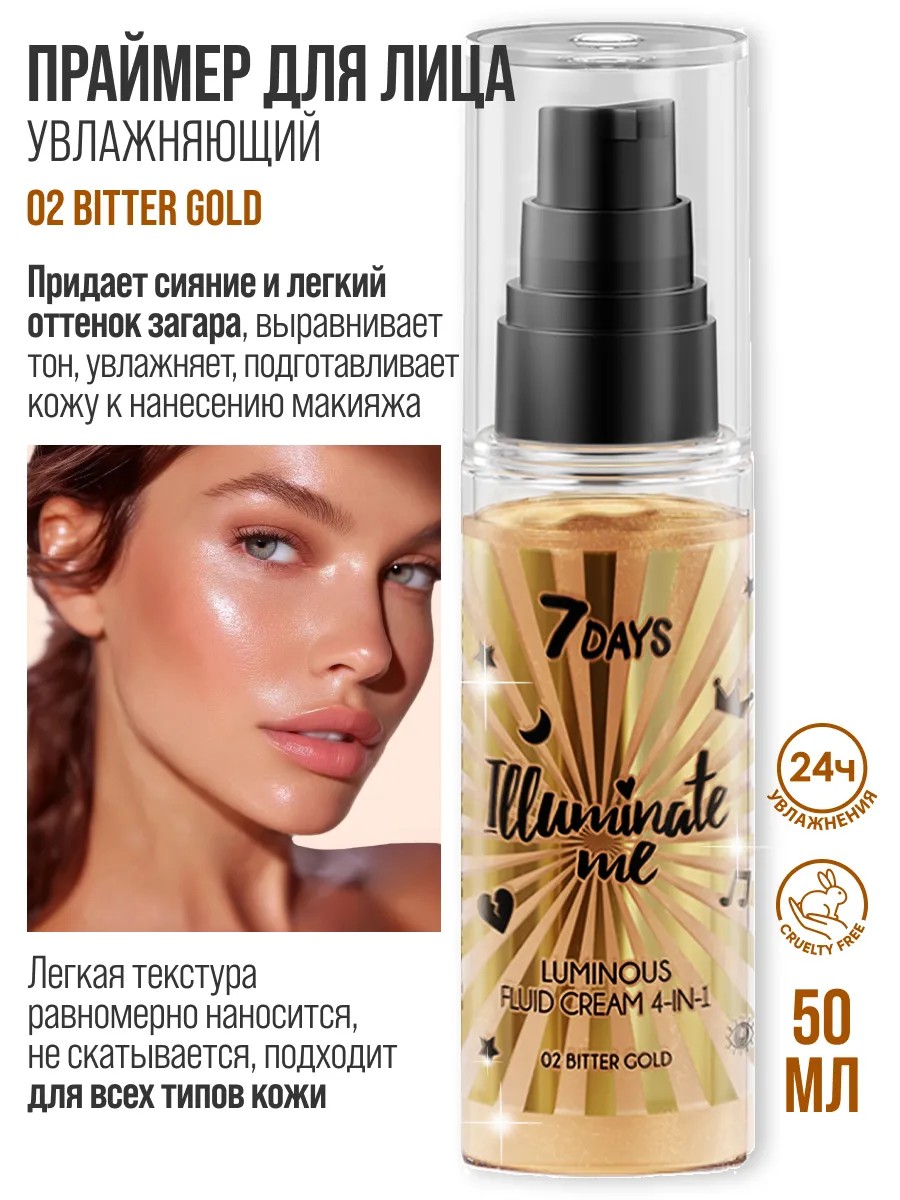 Праймер для лица увлажняющий сияющий 7DAYS 02 Bitter Gold — инновационный продукт для стойкой фиксации макияжа и ухода за кожей. База флюид 4в1 можно использовать как самостоятельное средство для ровной, увлажненной и сияющей кожи, а также как праймер для макияжа. Гелевая текстура создает липкое покрытие, за счет чего база обеспечивает максимальную фиксацию и длительную стойкость макияжа, не перегружая поры и позволяя коже дышать.