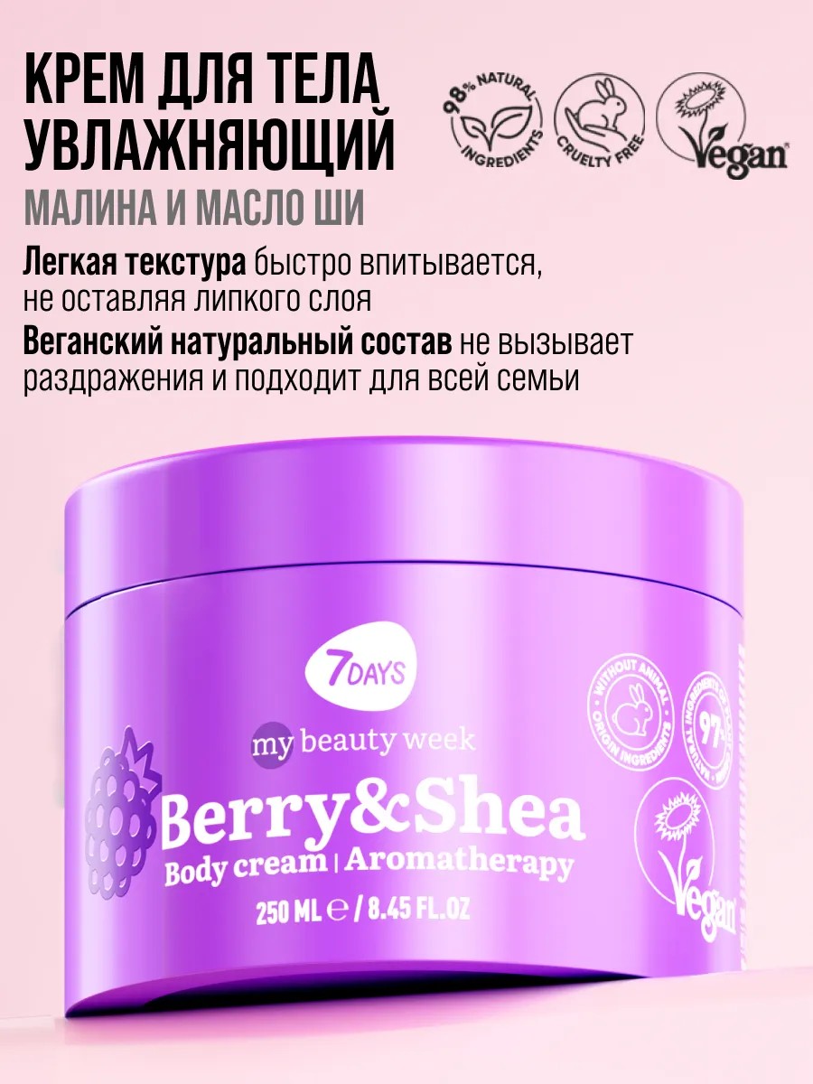 Крем для тела увлажняющий 7DAYS BERRY&SHEA MBW 250 ml с экстрактом Малины и маслом Ши оказывает расслабляющее действие, питает и смягчает кожу, успокаивает и интенсивно увлажняет.