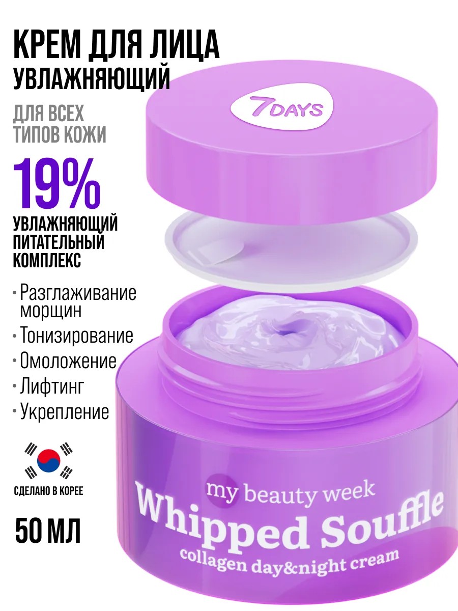 Дневной увлажняющий Крем для лица 7DAYS WHIPPED SOUFFLE COLLAGEN 50ML. Крем для лица увлажняющий с коллагеном – это идеальное средство для лица, для ежедневного ухода и увлажнение кожи. Косметика корея - Максимальное доверие покупателей! Коллаген для лица, крем от морщин с Витамином E и богатым комплексом натуральных масел и экстрактов обеспечивает интенсивное увлажнение, питание, ровный тон кожи, защиту и улучшение общего состояния кожи. Комплекс масел, успокаивает и восстанавливает кожу, снимая раздражения и воспаления, придает коже упругость и эластичность, от морщин, восстанавливает и напитывает кожу. Коллаген (collagen) - интенсивное увлажнение, выравнивает и заполняет морщины, способствует укреплению кожи. Нежная кремовая текстура с легким ароматом! Идеально подходит для всех типов кожи: сухая, жирная, комбинированная и проблемная. Помогает предотвратить воспаления, сухость кожи, шелушение.
