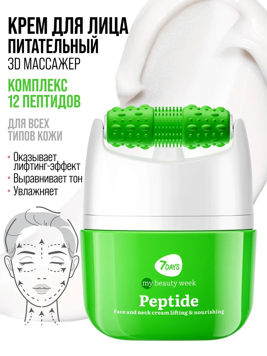 | Полное наименование товара | Крем для лица антивозрастной питательный с комплексом 12 пептидов, лифтинг, увлажнение, против морщин и купероза, массажер-роллер 2в1 для лица, шеи и декольте, для возрастной, жирной и проблемной кожи, корейская косметика 7DAYS MY BEAUTY WEEK, 40 мл |