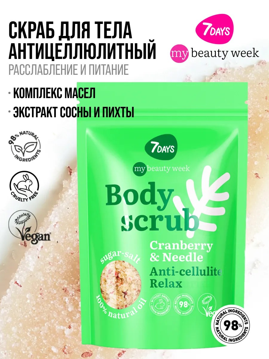 | Полное наименование товара | Скраб для тела антицеллюлитный, соляной, сахарный, с экстрактом клюквы, сосны и пихты, с хвойным ароматом и нотами ягод, для глубокого очищения и детоксикации кожи, отшелушивания, моделирования фигуры, выравнивания рельефа, питания и увлажнения, с антицеллюлитным и лифтинг-эффектом, натуральный состав 98%, сухой скраб для тела, рук, ног, пяток, от растяжек и целлюлита, профессиональный пилинг-уход, для женщин и мужчин, всесезонное использование, 7DAYS MY BEAUTY WEEK CRANBERRY&NEEDLE, корейская косметика. |