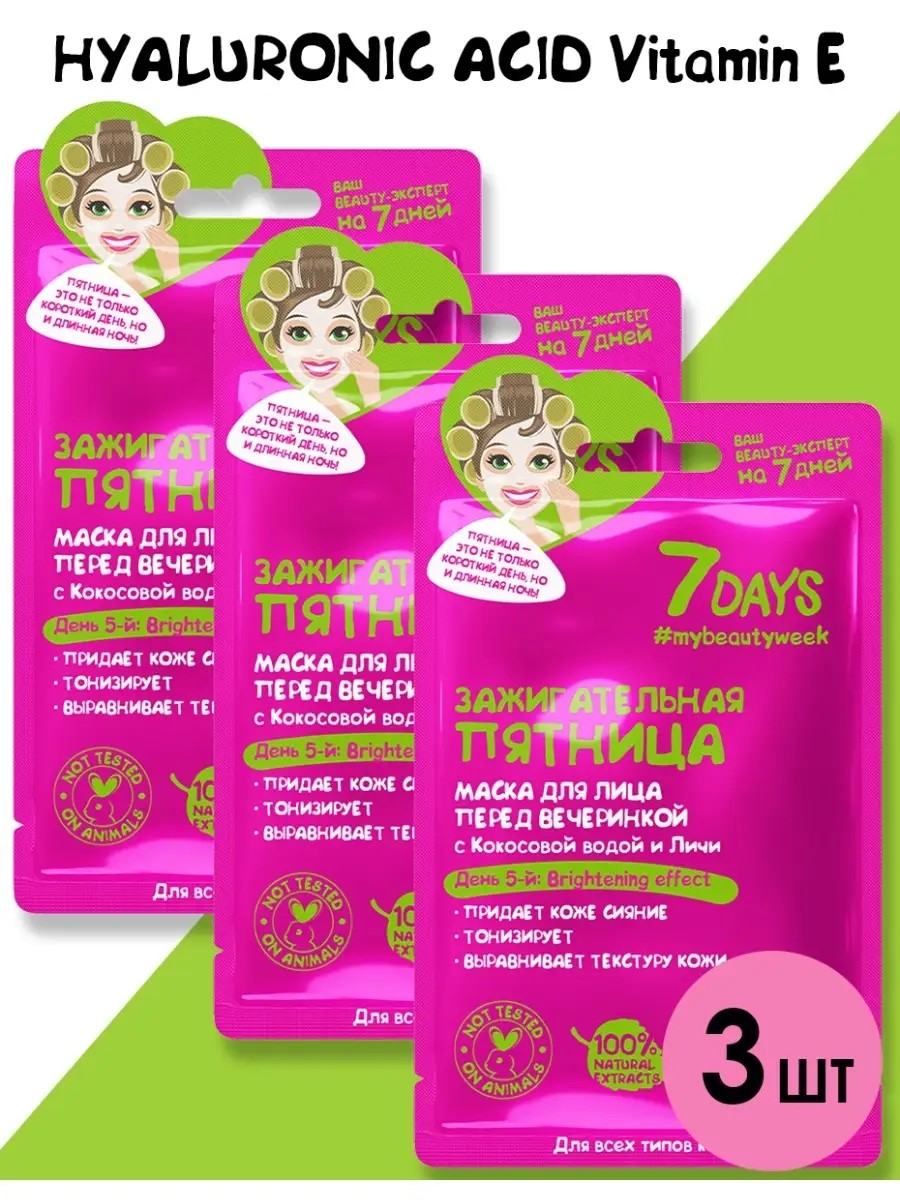 Ежедневный уход за кожей с тканевой маской для лица 7DAYS ЗАЖИГАТЕЛЬНАЯ ПЯТНИЦА. Это деликатное увлажнение, восстановление и питание для любого типа кожи. Инновационный комплекс в составе выполняет 7 важных функций: увлажнение, питание, придание сияния, выравнивание текстуры и тона кожи, тонизирование, восстановление, смягчение. Действует как компресс, увлажняющий глубокие слои кожи, снимает следы усталости, дарит коже здоровый и отдохнувший вид. Сыворотка в составе мгновенно увлажняет кожу и дарит ощущение комфорта, как после массажа. Экстракт личи, кокосовая вода, гиалуроновая кислота, масло арганы - основные действующие компоненты маски для лица.