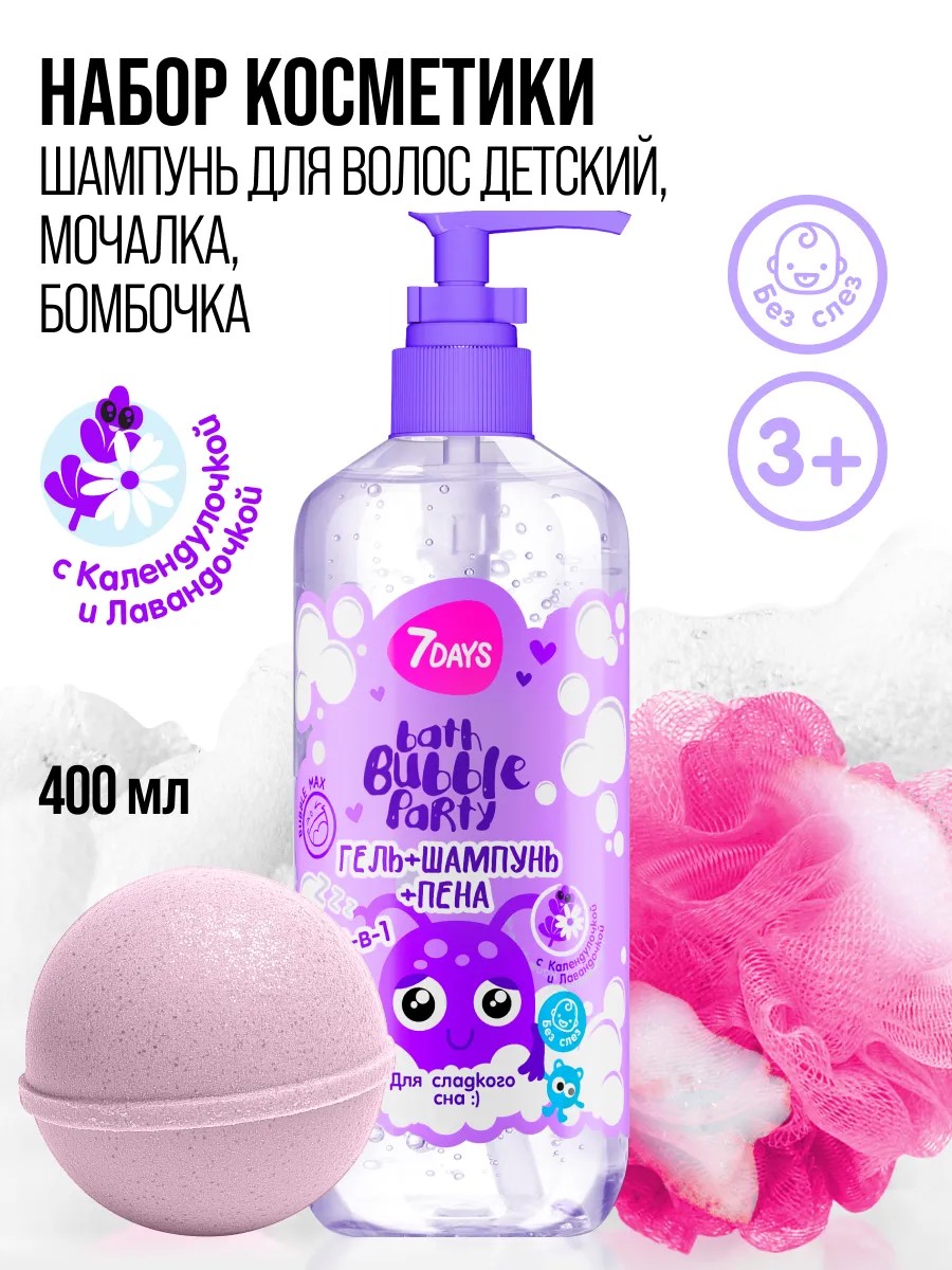 | Полное наименование товара | Набор детской косметики 7DAYS Bath Bubble Party, 3 в 1, гель для душа, детский шампунь, для волос пена для ванны с ароматом календулы и лаванды, 400 мл, бомбочка для ванны, мочалка, гипоаллергенная для детей от 3 лет, без сульфатов, парабенов и красителей, бережное очищение, увлажнение и уход для чувствительной кожи малыша, подарочный набор для девочек и мальчиков |