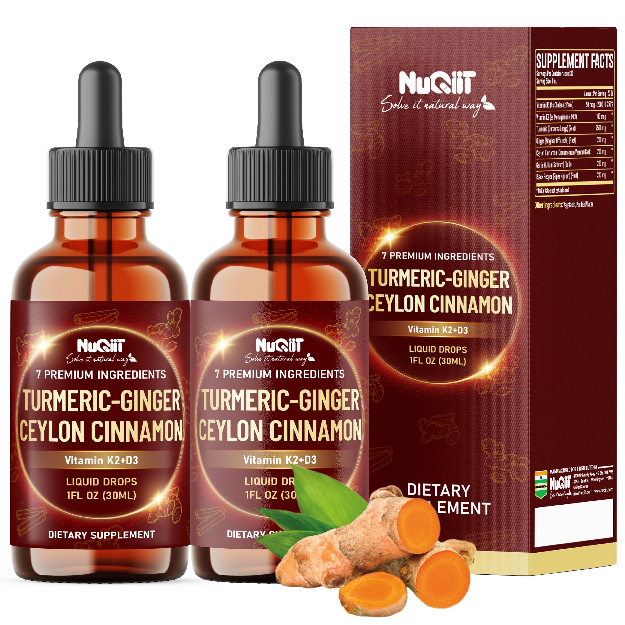 Health and Safety as The Top Priorities: At NUQIIT, we understand the importance of your wellness. All ingredients have their advantages that might be beneficial to you. It's truly simple to have all of it in one. It saves you from having to order a bunch of bottles protects your financing. Verified COA Lab Tested - 7in1 Turmeric Liquid Drops analyzed for purity heavy metals. All remedies are non-GMO, gluten-free, and vegetarian-friendly. The manufacturer is qualified with Global Standards as a cGMP, ISO, Halal FDA-registered facility with advanced extraction technology. Experience the Finest Quality Ingredients: NUQIIT Turmeric Liquid Blend (1ml 30ml) combines premium quality extracts of Turmeric Root, Vitamin D3, K2, Ginger, Ceylon Cinnamon, Garlic and Black Pepper to support immune health and overall wellness goals. Easy Daily Routine: Take 1ml of Liquid Turmeric per day. Each bottle provides a 2 full month supply, easy to take directly or mix with your favorite drink. NUQIIT : 7in1 Turmeric Curcumin Liquid, Vitamin D3, K2, Ginger, Ceylon Cinnamon, Garlic and Black Pepper is designed to support your immune system and heart.