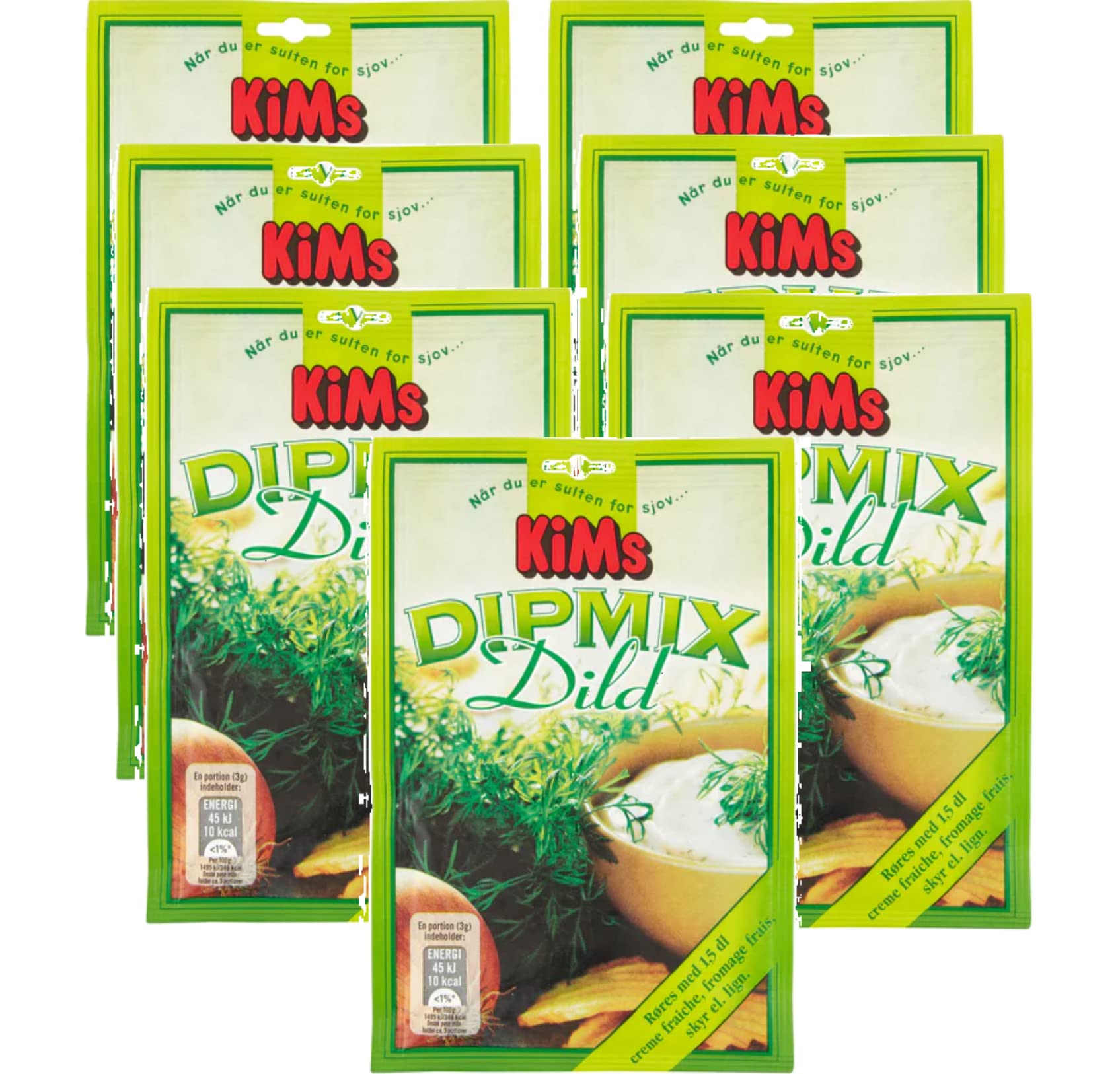 INGREDIENTS maltodextrin (potatoes, corn), milk sugar (milk), modified potato starch, sugar, salt, dill (3 ), onion powder, flavor enhancer (E621), yeast extract, dill extract, flavouring. INSTRUCTIONS FOR USE Stir 14g Kim's Dip Mix Dill into 1 cup mayonnaise and 2 cups cream. Stir and serve with chips or cream cheese. Can also be used as a marinade for chicken or salmon.7x Kims Dip Mix Dille 14g INGREDIËNTEN maltodextrine (aardappelen, mais), melksuiker (melk), gemodificeerd aardappelzetmeel, suiker, eetzout, diill (3 ), uienpoeder, smaakversterker (E621), gistextract, dillextract, aroma. GEBRUIKSAANWIJZING Roer 14g Kim's Dip Mix Dill door 1 kopje mayonaise en 2 kopjes room. Roer en serveer met chips of roomkaas. Kan ook worden gebruikt als marinade voor kip of zalm.