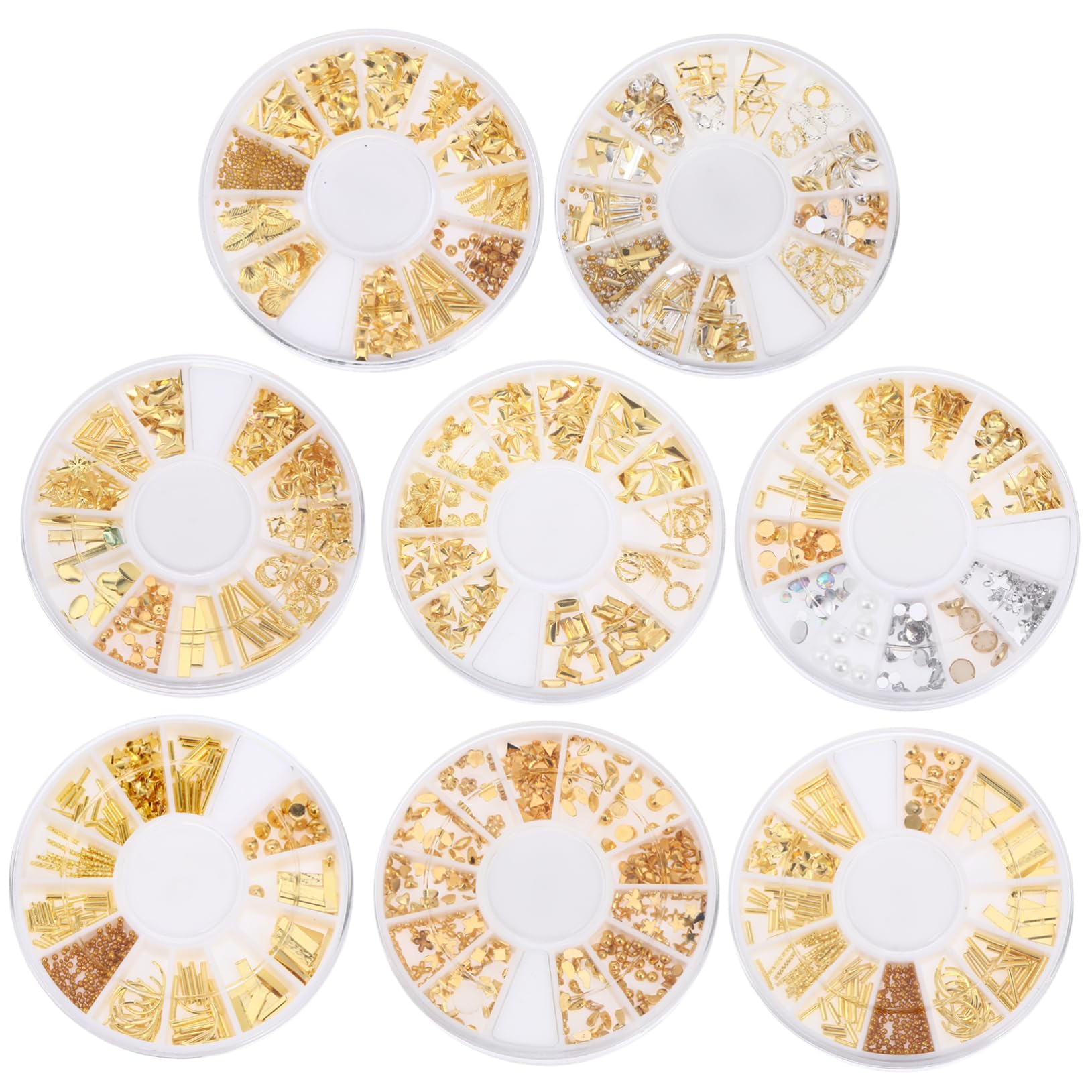 Package Include 8 Boxes x Nail Decorations (Assorted Style) Characteristics - Size: 6.00X6.00X1.00 cm 2.36X2.36X0.39 inch Nail Studs. - Material: Alloy Plastic DIY Accessories for Nail. - Color: Golden Manicures Decoration. - Made of , no harm, not easy to break, durable for long term use Manicure DIY Decor. - Fabulous effect of the nail decoration will make your nail art more attractive and elegant DIY Manicure Ornament. - Quick to apply, just a few seconds, you can get the fine nail art design, suitable for both beginners or professional nail salons Manicure Decor. - Beautiful and shinning color will never out of style,meet with all the fashion Rivet Nail Decor. - It is fun to DIY nail art with your family or friends when family gathering, enjoy your own unique nails and good time Nail Accessory. Goods Information DIY Manicure Ornament Exquisite and beautiful, designed with chic and beautiful colors, look great on your nail, make you look more beautiful and elegant.Nail Art Supplies These nail decal studs with creative shapes, can be used to design your own nail art, highlight, etc.Nail Studs Great combination for you to DIY nail decorationsDIY accessories for nail: elegant and fashionable, highlight you appearance, make your nail look so eye-catching and glitter. Manicures decoration: different design for satisfying your different needs, enough for your daily spare and replacement. Nail art decor: DIY by yourself, it allow you to enjoy the fun of nail art. Manicures accessories: it is fun to DIY nail art with your family or friends when family gathering, enjoy your own unique nails and good time. Manicure decor: dazzling nail art accessories, really gives you the beauty and sparkle you want to your decoration.