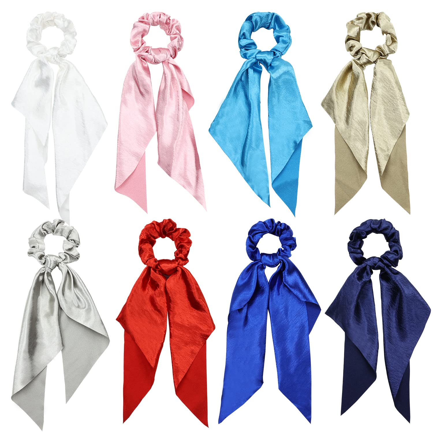 8 Pack Colorful Solid Satin Long Ribbon Knotted Hair Bows Scrunchies Hair Ties Ponytail Holder Headbands Elastics Rubber Hairbands Bubbles Rings Accessories for Women Specifications: -Material: satin, rubber. -Color: White, Champagne, Pink, Gold, Silver, Burgundy Red, Lake Blue, Royal Blue and Navy. -Size: The diameter of hair tie ring is: 7cm/2.76inch The length of pony tail bow is 27cm/10.6inch -Weight: approx 12g/piece. Package includes: 8 pack long satin ribbon knotted bow scrunchies hair ties. Service Guarantees: Love your choice or Get money back - We always strive to provide a great satisfaction shopping experience. Your satisfaction is our final goal, if you are not satisfied with our product or service for any reason, please feel free to tell us for a fast solution.[Wide Occasions]: These satin long ribbon scrunchies hair ties are specially designed for medium to long hair when sports, yoga, workout, and other occasions. it also a handy ties to help you make buns, to holder your ponytail, curly hair, thick or long hair whenever you need to put your hair back, when makeup, washing face, cooking. It's also a good gift to your female friends. [8 Versatile colors]: The multipack scrunchies include White, Champagne, Pink, Gold, Silver, Burgundy Red, Lake Blue, Royal Blue and Navy, total 9 assorted solid colors, whether you are looking to match your blondes, brunettes, redheads black and any between colors, or just add glamour to your hairstyles, messy bun, or braids. All hair bow ties pack in the zipper bag as an organizer for daily use. [Fabric Covered Design]: They are completely snag-free, the satin fabric covered design makes it no crease and painless after using a long time on your ponytail hair. [Elastic Size]: The diameter of the velvet cloth scrunchy ring is 7cm/2.76inch, and it can be stretched to a longer size to fit any hairstyle. The long tail bow is 27cm/10.6inch, very cute and fluffy. The long tail hair bow can be separated into a scarf for use. [High level Workmanship]: The fabric covered scrunchies are made of high quality satin, it's smooth and soft to touch, the rubber band inside is very stretchy, which comfort wear and prevent hair from tangling and breakage when use it.Best Sellers Rank: See Top 100 in Beauty & Personal Care. Hair Type: All, Curly. Brand: Lawie. Item Form: Scrunchie. Material: Satin, Rubber. Color: White, Champagne, Pink, Gold, Silver, Burgundy Red, Royal Blue, Navy. : B0B2W76PF8. Manufacturer: Lawie. Package Dimensions: 7.6 x 6.1 x 2.48 inches; 8.78 Ounces.