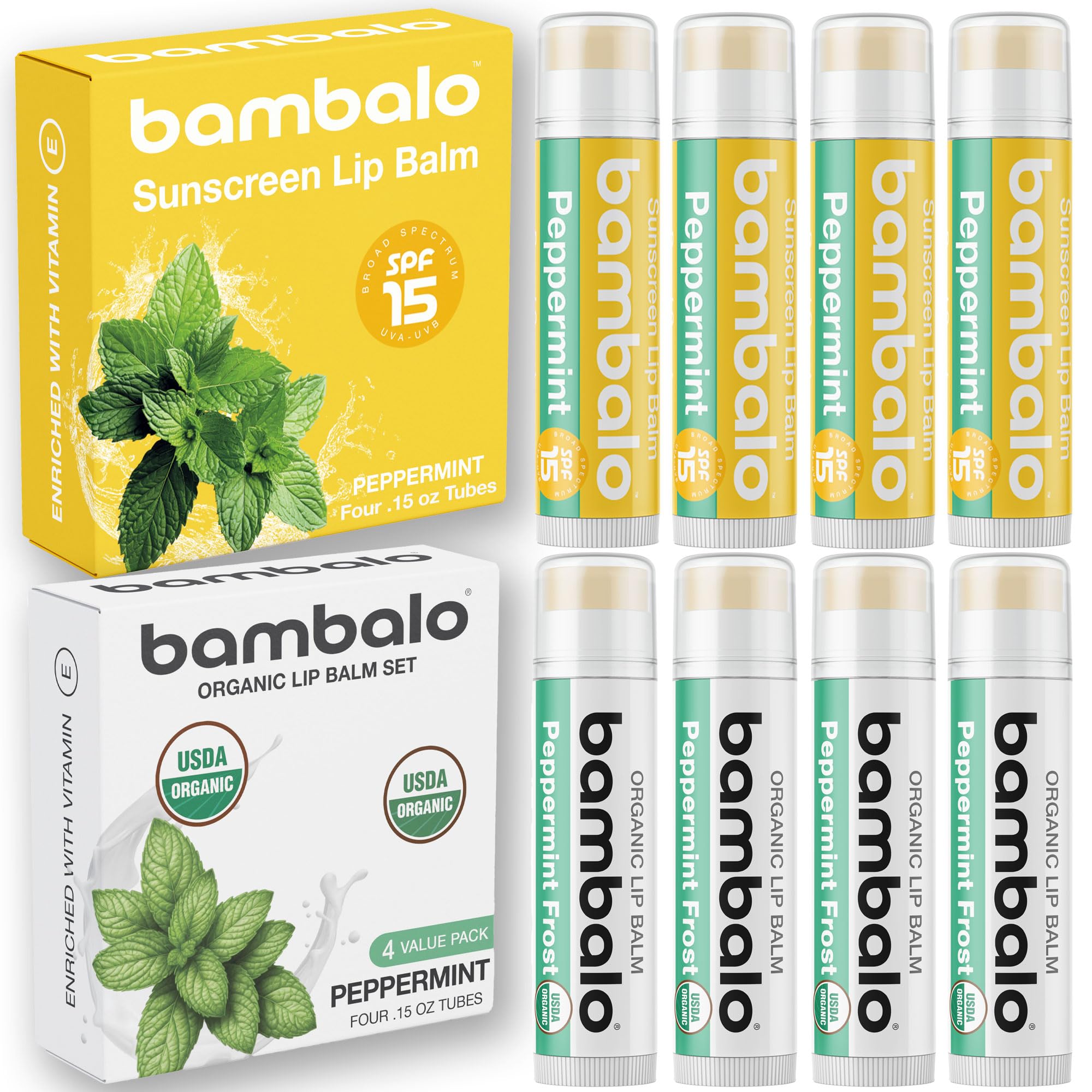 Experience the ultimate lip care with the Bambalo Organic SPF 15 Peppermint Lip Balm 8-Pack. This bundle includes four USDA Organic Peppermint lip balms, made with beeswax and coconut oil, to hydrate, soothe, and repair dry lips. Paired with four SPF 15 Peppermint lip balms, this set provides broad-spectrum UVA UVB protection, shielding lips from sunburn, wind damage, and dryness. The refreshing peppermint flavor offers a cooling sensation, perfect for daily use, travel, and outdoor activities. These lip balms are lightweight, non-greasy, and long-lasting, ensuring soft, smooth lips year-round. Made in the USA with 100 renewable energy, they are paraben-free, cruelty-free, and petrochemical-free. Whether for everyday hydration, sun protection, or as a thoughtful gift, this set is a must-have for soft, nourished lips in all seasons.Great Gift for Any Occasion – This peppermint lip balm set is a thoughtful holiday gift, stocking stuffer, or travel essential for men and women. Keep lips hydrated, smooth, and protected in all seasons with this cooling, sun-protective duo. Clean, Safe Eco-Friendly – Made with USDA Organic, cruelty-free, and paraben-free ingredients, these balms are petrochemical-free and produced in the USA with 100 renewable energy, using 30 less plastic for a sustainable choice. Perfect for Travel Outdoor Use – Compact and easy to carry, these balms fit in pockets, purses, and backpacks. Ideal for hiking, skiing, beach trips, or daily protection, offering all-day hydration and SPF defense. Hydrates Prevents Chapped Lips – Organic beeswax and coconut oil lock in moisture, repair cracked lips, and provide deep hydration. SPF 15 shields against sun damage, wind, and dryness, keeping lips smooth and protected. Cooling Peppermint Lip Care – Includes 4 USDA Organic lip balms for hydration 4 SPF 15 lip balms for broad-spectrum UVA UVB protection. The refreshing peppermint formula cools, soothes, and keeps lips soft and moisturized year-round.