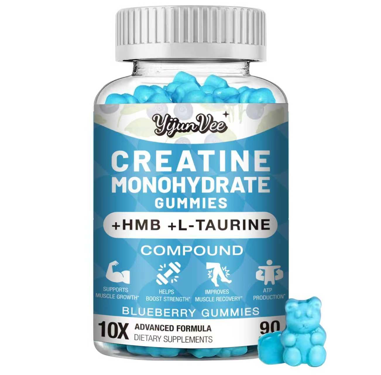 Made In The USA Third-Party Tested :Produced in GMP-compliant facilities with globally sourced ingredients, every batch of our creatine gummies is rigorously tested to ensure quality, purity, and performance you can trust. Delicious Blueberry Flavor, Convenient To Take :Say goodbye to messy powders and mixing.Our refreshing blue raspberry flavor makes every gummy an indulgence. Each serving of creatine gummy contains 8 grams of creatine, enjoy ultimate convenience and performance benefits in every bite. Synergistic Defense, Comprehensive Muscle Protection :YijunVee creatine gummies support athletic performance by increg muscle energy production.The L-Taurine and creatine in the formula work together to help regulate muscle contractions.This not only alleviates muscle soreness and fatigue after exercise but also supports faster recovery.In addition, vitamins B6 and B12 work together to provide comprehensive protection and support for your muscles during your arduous training period. Enhance Exercise Endurance Energy :Creatine monohydrate rapidly boosts your ATP energy system, enabling you to lift greater weights or exercise with greater intensity, achieving explosive breakthroughs.Meanwhile, left L-carnitine, BCAA and HMB are key signaling molecules for muscle protein synthesis, which can be directly utilized by muscles and help promote fat energy supply during endurance training.They are ideal choices for men and women seeking to enhance energy and endurance. 8000MG High Quality Creatine HMB Monohydrate Gummies :Creatine is one of the most widely supported sports nutrients.YijunVee is different from traditional Creatine Gummies.8000MG creatine monohydrate, it effectively helps generate more energy during efficient training promotes rapid muscle absorption, enhances exercise endurance and recovery speed, supports you in breaking through your limits, and is suitable for supplementation at any time before and after fitness.