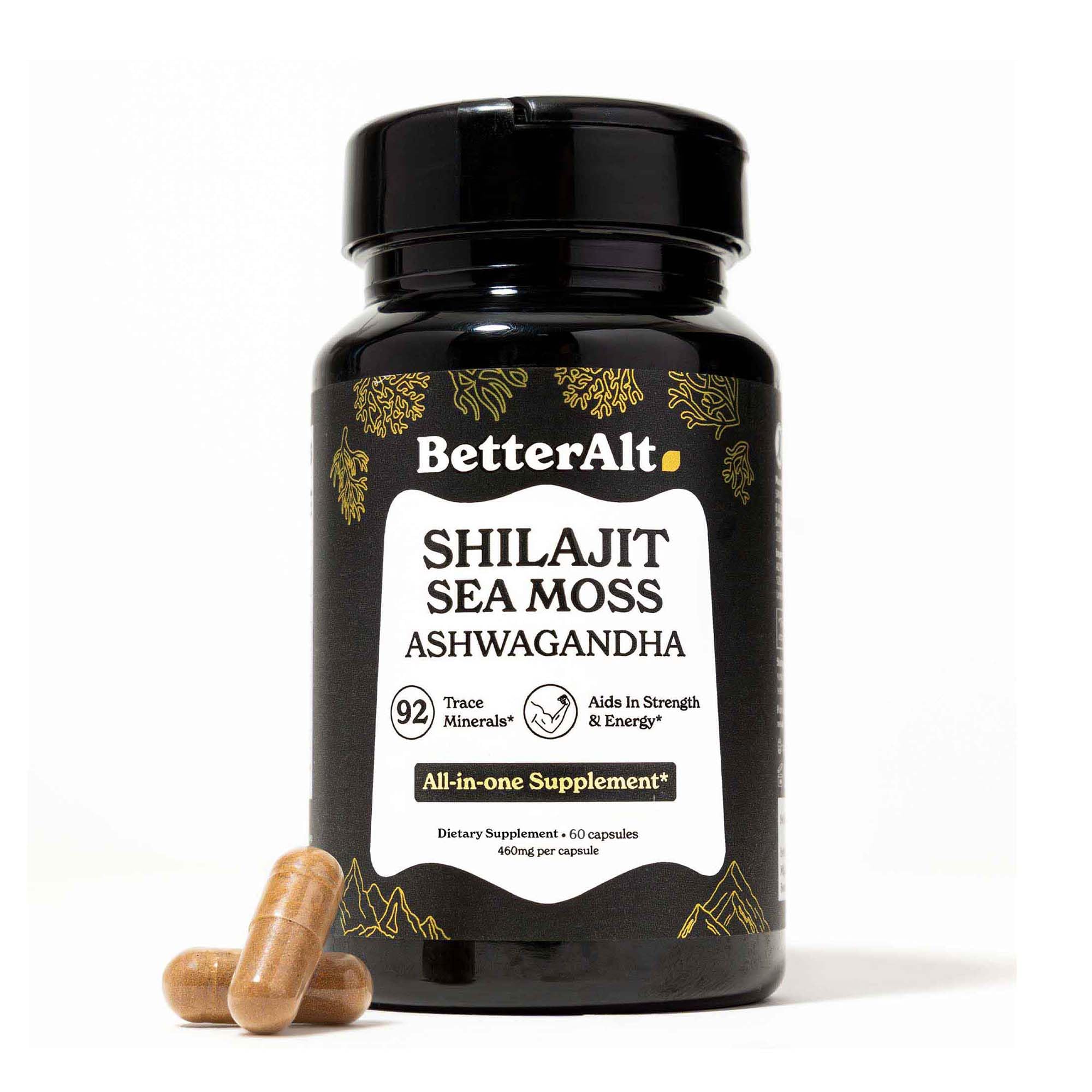 Better Alt Shiljait All in One Capsule with Ashwagandha, seamoss, safed musli, maca root, black pepper. This capsules has all in one supllemnts for your overall well being.Also Searched As - pure shilajit, pure himalayan shilajit, shilajit sea moss tongkat ali ashwagandh, alpha gummies, 10 in one shilajit gummies, shilajit capsules for men, maca root capsules for men, maca ashwagandha, gingko biloba capsules, panax ginseng root extract. Enhanced Absorption with Black Pepper Extract - Formulated with 50 mg black pepper extract (piperine), known to support bioavailability and nutrient uptake, helping your body utilize key minerals and herbal actives more efficiently in a single, convenient all-in-one capsule. Cognitive Performance Support from Ginkgo Biloba Safed Musli - Each capsule has 1000 mg Ginkgo Biloba known for supporting healthy circulation and oxygen flow, and 1000 mg of Safed Musli known for promoting physical vigor—working together to support overall performance and stamina. Adaptogenic Herbs Ashwagandha, Panax Ginseng, Maca Root for Balance Everyday Vitality - Includes 1800 mg Ashwagandha, 500 mg Panax Ginseng, and 500 mg Maca Root—three well-researched adaptogens traditionally used to promote steady energy, and maintain a sense of balance and well-being throughout the day. Multi-Source Nutrient Matrix with Sea Moss Zinc - 2000 mg Sea Moss contributes naturally occurring iodine, magnesium, and diverse micronutrients, while added zinc supports normal immune function and metabolic activity—helping users rely on one balanced supplement for broad-spectrum daily wellness support. 8800 mg High-Fulvic Shilajit (75 Fulvic Content) - Each serving delivers a potent herbal complex featuring high-purity Shilajit known for its rich fulvic acid profile (75 ) and 95 naturally occurring trace minerals that support nutrient absorption, cellular energy processes, and overall vitality.