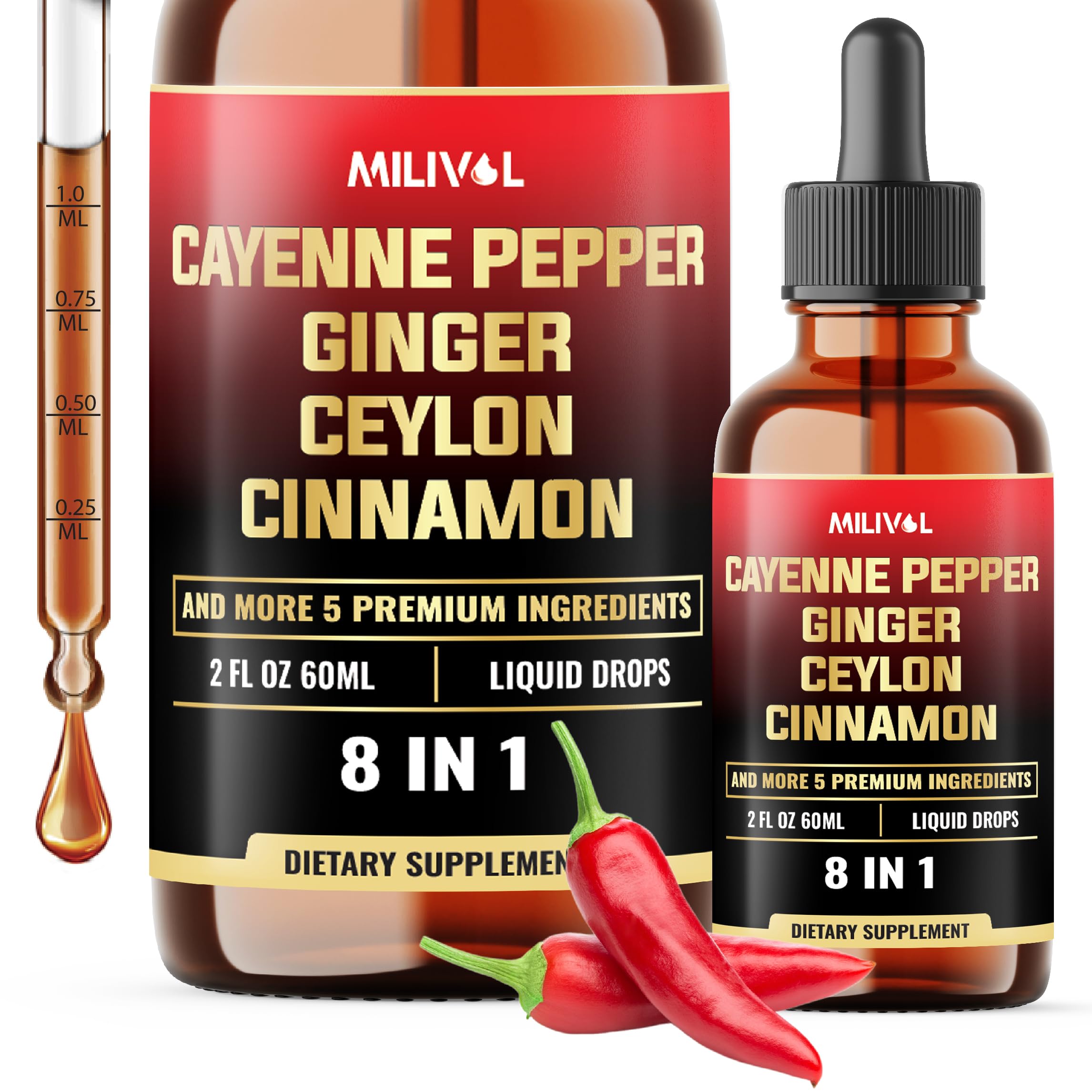 ✓ Guaranteed Satisfaction: Support your health and wellness journey. When you choose our Cayenne Pepper Liquid Drops, you're choosing a product backed by rigorous quality standards and a commitment to excellence. ✓ Commit to Quality: Milivol is dedicated to sourcing the finest ingredients to create trusted supplements. Every batch is non-GMO and third-party tested for quality, integrity, and potency, ensuring they meet the Exceptional standards. ✓ Easy to Use: Each Cayenne Pepper Extract Drops contains 60ml of liquid, providing a 60-day supply. Only 1ml per day, it's simple to incorporate into your daily routine. ✓ General Benefits: Cayenne Pepper Drops are crafted to support overall vitality. The combination of 8 other herbal ingredients supports digestive comfort and circulatory function, contributing to a well-balanced and energized body. ✓ Full attention: Liquid Cayenne Pepper Supplements include a blend of Cayenne Pepper, Ginger Root, Ceylon Cinnamon, Turmeric Curcumin Root, Berberine HCl, Holy Basil, Peppermint Leaf, and Apple Cider Vinegar. This potent combination is designed to support your well-being.
