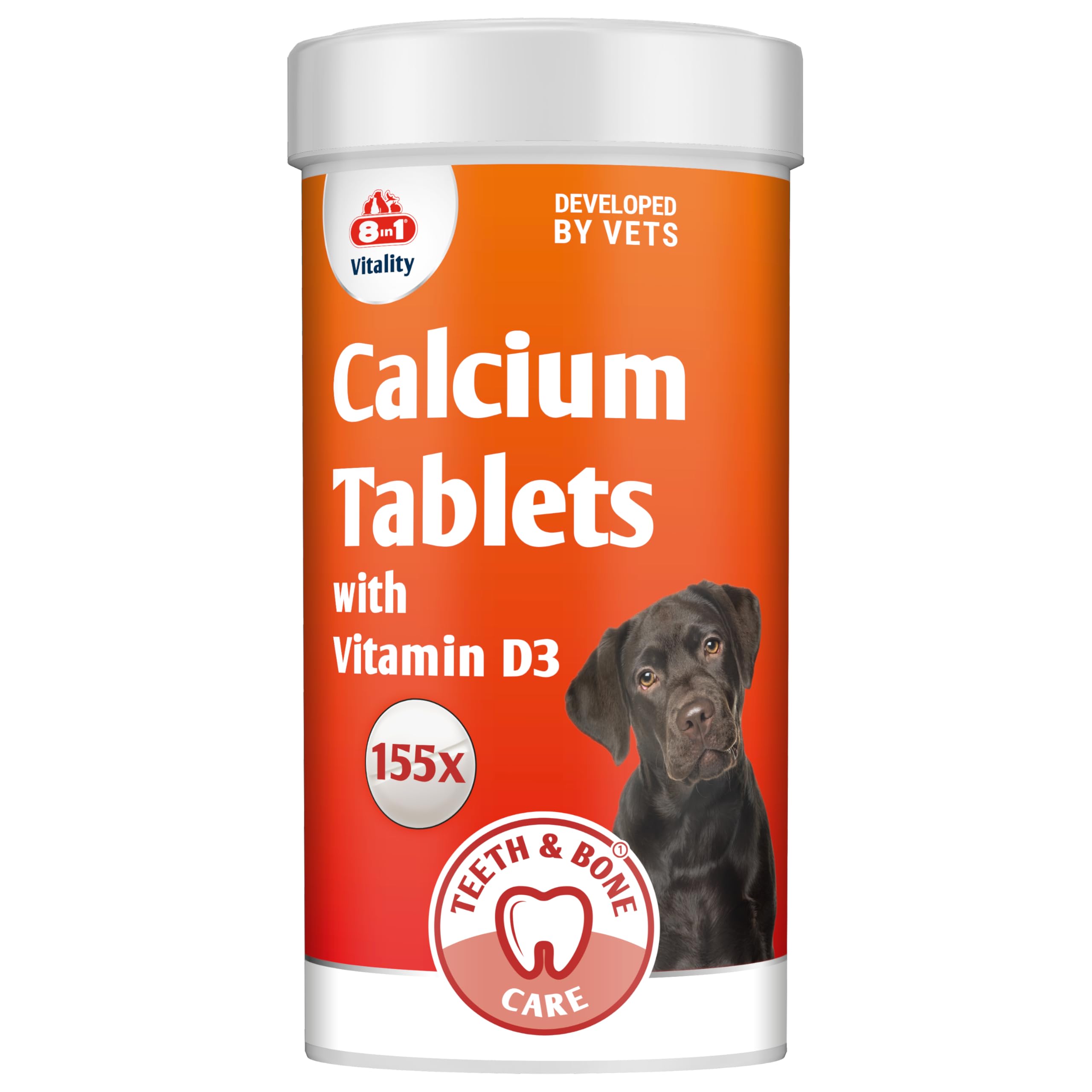8in1 Calcium Tablets are an excellent daily supplement to promote strong bones and healthy teeth. They provide calcium and phosphorus which are essential for the development and maintenance of healthy bone structure. In addition, 8in1 tablets contain vitamin D3 to promote optimal calcium absorption. The formula developed in collaboration with veterinarians is especially recommended for puppies during active growth, as they may have higher nutritional needs than other dogs. The 8in1 Calcium tablets do not contain artificial colors or preservatives and are produced in Germany. INGREDIENTS Composition: minerals, milk and milk derivatives, oils and fats, vegetable by-products. Analytical constituents: protein 1 , fat content 6 , crude fiber 0.5 , crude ash 37 , moisture 8 , calcium 10 , phosphorus 7.5 . Additives: ( kg), vitamins: Vitamin D3: 4462668UI.Without artificial colors or preservatives, contents: 1 8in1 calcium tablet (155 tablets). Developed in collaboration with veterinarians and produced in Germany. Daily supplement, especially for puppies during the active growth phase, which have a higher nutritional requirement than other dogs. Calcium tablets also contain vitamin D3 to promote calcium absorption. In addition to calcium, the formula also contains phosphorus to promote strong bones and healthy teeth. 8in1 Vitality calcium tablets for all dogs.8in1 Calciumtabletten voor honden - Als voedingssupplement voor alle honden 1 blik (155 tabletten) 8in1 Calciumtabletten zijn een uitstekende dagelijkse aanvulling om sterke botten en gezonde tanden te bevorderen. Ze leveren calcium en fosfor die essentieel zijn voor de ontwikkeling en het behoud van een gezonde botstructuur. Daarnaast bevatten 8in1 tabletten vitamine D3 om de optimale calciumopname te bevorderen. De in samenwerking met dierenartsen ontwikkelde formule wordt vooral aanbevolen voor puppy's tijdens de actieve groei, omdat ze mogelijk een hogere voedingsbehoefte hebben dan andere honden. De 8in1 Calciumtabletten bevatten geen kunstmatige kleur- en conserveringsmiddelen en worden in Duitsland geproduceerd. INGREDIËNTEN Samenstelling: mineralen, melk en melkderivaten, oliën en vetten, plantaardige bijproducten. Analytische bestanddelen: proteïne 1 , vetgehalte 6 , ruwe vezels 0,5 , ruwe as 37 , vocht 8 , calcium 10 , fosfor 7,5 . Additieven: ( kg), vitaminen: Vitamine D3: 4462668UI.Zonder kunstmatige kleur- of conserveringsmiddelen, inhoud: 1 8in1 calciumtablet (155 tabletten). Ontwikkeld in samenwerking met dierenartsen en geproduceerd in Duitsland. Dagelijkse supplement, vooral voor puppy's tijdens de actieve groeifase, die een hogere voedingsbehoefte hebben dan andere honden. Calciumtabletten bevatten ook vitamine D3 om de calciumopname te bevorderen. Naast calcium bevat de formule ook fosfor om sterke botten en gezonde tanden te bevorderen. 8in1 Vitality calciumtabletten voor alle honden.