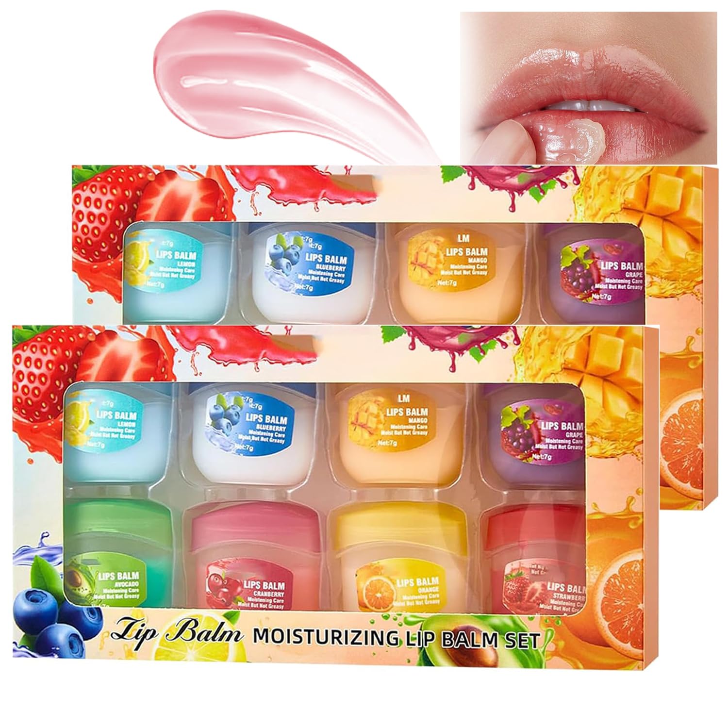 8pcs Fruit Flavored Lip Care Set 8Pcs Fruit Flavored Lip Care Set,Lip Balm Set,4-in-1 Mini Lip Balms for Moisturizing Repairing,Can be Used as Glosses,Night Balms,Colorless Lipsticks and Moisturizing Masks Specifications: Name: 8Pcs Fruit Flavored Lip Care Set Size: 1.4 0.8 1.4 in Weight: 3.53 ounces 7 g Number of Pieces: A box of 8 pcs Flavored:Strawberry Lemon Blueberry Cranberry Grape Avocado Orange Mango Package Includes: 1 2SET Lip Balm Set Note: 1.Please allow 0 1 inch error due to manual measurement. Thanks for your understanding 2.Monitors are not calibrated same, item color displayed in photos may be showing slightly different from the real object. Please take the real one as standardSpecial Gift: This 8Pcs Fruit Flavored Lip Care Set is perfect as a gift, making it a special gift for people around you, birthdays, Christmas, and Thanksgiving. Carefully designed: The appearance design of the film set is simple and elegant, small and cute, easy to carry, suitable for personal use or as a gift, balancing practicality and aesthetics. It is convenient to use. Repair Function: In addition to moisturizing, it can effectively solve the following lip problems: dry peeling, dark, and reduce lip lines. At the same time, it can also improve the hydration and elasticity of the lips. Perfect Combination: This lip mask set includes eight flavors: mango, grape, blueberry, orange, avocado, strawberry, cranberry, and lemon. It is moisturizes all day long, and has a lightweight texture without being heavy with a natural lip color. Moisturizing Function: Our lip mask set can quickly penetrate the lip skin and deeply hydrate it. After using it for a period of time, you will noticeably feel your lips becoming softer and more moist.