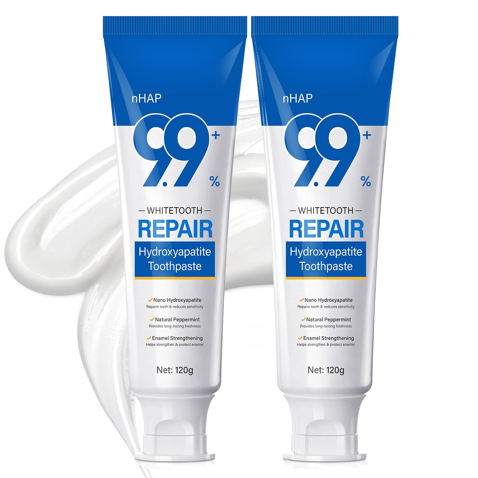 INGREDIENTS: Water, Hydrated Silica, Nano-Hydroxyapatite, Nicotinamide, Sodium Lauryl Sulfate (SLS), Cellulose Gum, Lysozyme, Peppermint Oil. HOW TO USE: Simply apply a pea-sized amount of toothpaste to your toothbrush. Use the proper brushing technique for 2-3 minutes, then rinse with water for a clean, refreshed feel. For best results, brush your teeth twice daily, in the morning and evening.FRESHENS BREATH - Infused with Natural Peppermint, It Delivers a Refreshing, Clean Sensation that Lasts all Day. Providing a Oral Care Routine Suitable for all Ages, Your Journey to A Radiant Smile Begins Now!. GENTLE NON-IRRITATING - Fluoride-Free Safe for Long-Term Use, Supports Overall Oral Care, Keeping Your Teeth Strong and Your Mouth Feeling Fresh with Regular Brushing. Very Suitable for Sensitive Teeth, Without Causing Discomfort or Irritation. WHITER REPAIRS TOOTH - With the Power of Niacinamide, This Advanced Formula Helps Reduce Surface Stains, Enhance Natural Whiteness, And Promote Gum Health. Its Gentle Yet Effective Cleansing Action Strengthens Enamel and Protects Against Cavities, Giving You a Radiant Smile. TOOTH PROTECTION - Our Toothpaste Contains Nano-Hydroxyapatite, A Naturally Occurring Mineral That is Designed to Repair and Protect Tooth Enamel, Reducing Cavity Risk and Erosion, Thus Promoting Lasting Oral Health for You and Your Family. NANO HYDROXYAPATITE TOOTHPASTE - 9.9 Hydroxyapatite Toothpaste is The Ultimate Solution for a Healthier. Just One Tube of Toothpaste can Meet Your Multiple Needs at the Same Time.