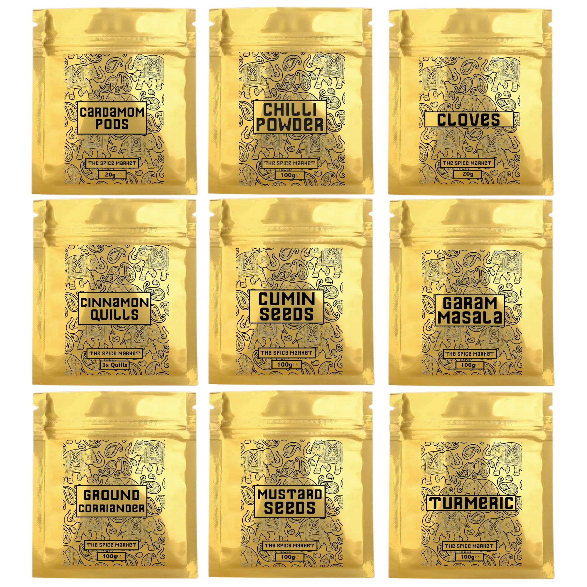 9 Authentic Golden Indian Spices Curry Luxury Set - 9 Spices for Cooking Gifts Resealable Bags Tandoori Turmeric Garam Masala Chilli Powder Indian Curries