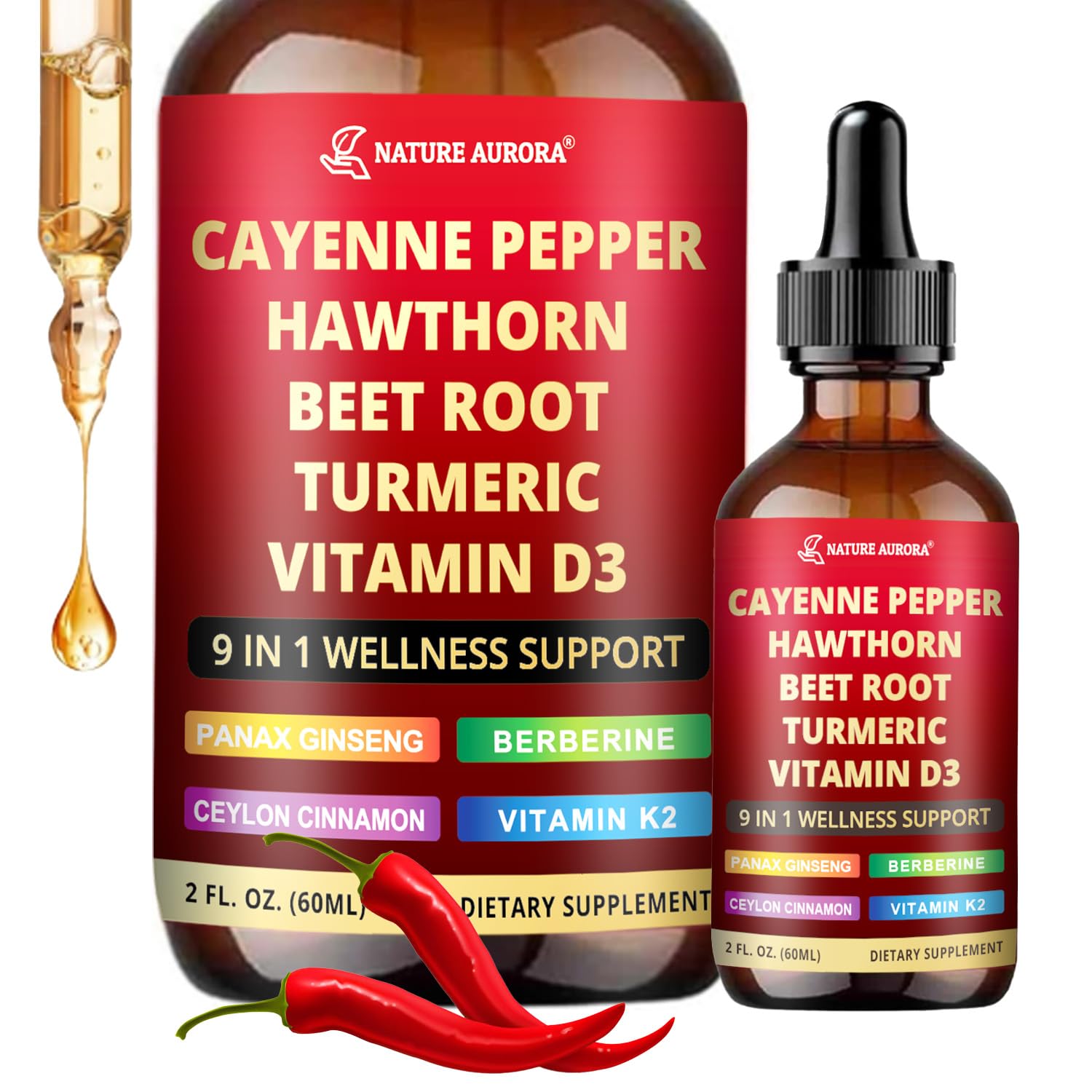 9 in1 Cayenne Pepper Liquid Drops - Cayenne Pepper Extract Drops Supplement Liquid + Hawthorn Berry Beetroot Turmeric Vitamin K2 & D3 - Digestion Immune and Circulation Support - 2 Fl Oz 2.0 oz (Pack of 1)