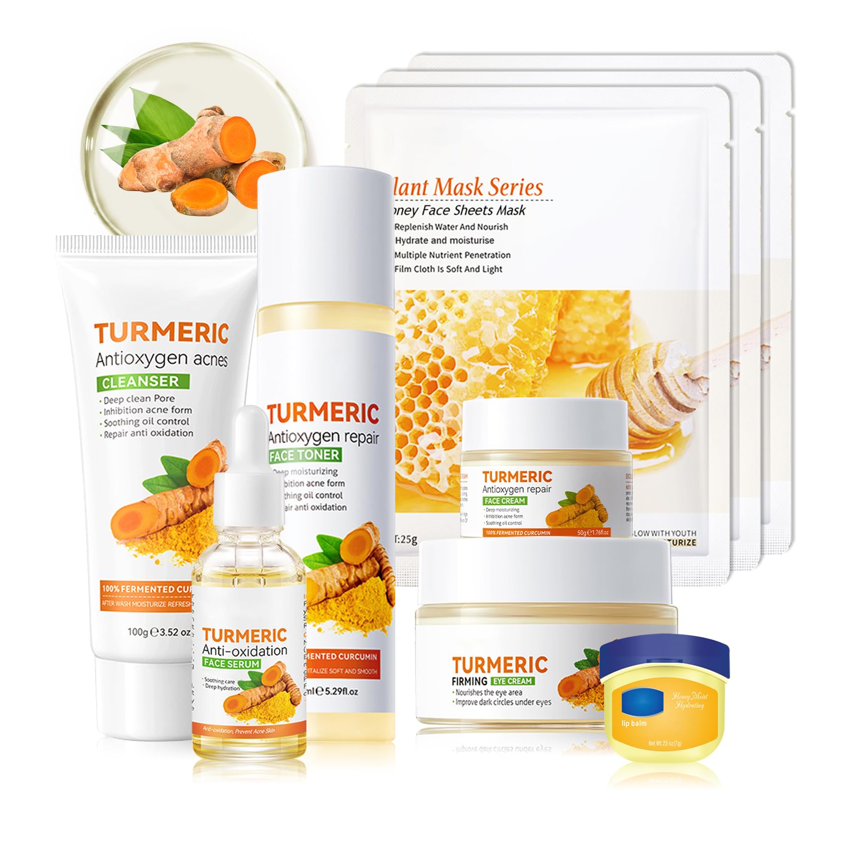 Ideal Skin Care Kit: Each skincare product in the kit has been carefully matched and designed specifically for women and men who are looking for beautiful skin, with this exquisite skin care kit, you will never have to worry about your skin not being properly hydrated again, perfect to include it in your gift list. Highly Effective Hydration and Moisturization: Facial skincare kit has a strong moisturizing effect, providing your skin with all-round moisturizing and hydration, so that your skin stays hydrated all day long, all-round to create a highly effective skincare experience for you. Refreshing Texture: Face skin care set has a refreshing non-sticky texture and gentle ingredients that are suitable for all skin types, whether you have oily, normal, dry or sensitive skin, it is ideal for use in the morning and evening. Superior Skin Care Ingredients: Skin care kit contains superior ingredients, which are highly hydrating and quickly absorbed by the skin, giving your skin tons of moisture for a more refined and plumped up look. Turmeric Facial Skincare Sets: Moisturizing skincare kit contains 7 must-have daily moisturizing skincare products including cleanser, toner, facial serum, face cream, eye cream, moisturizing lip balm and moisturizing face mask, which can satisfy all your skincare needs.