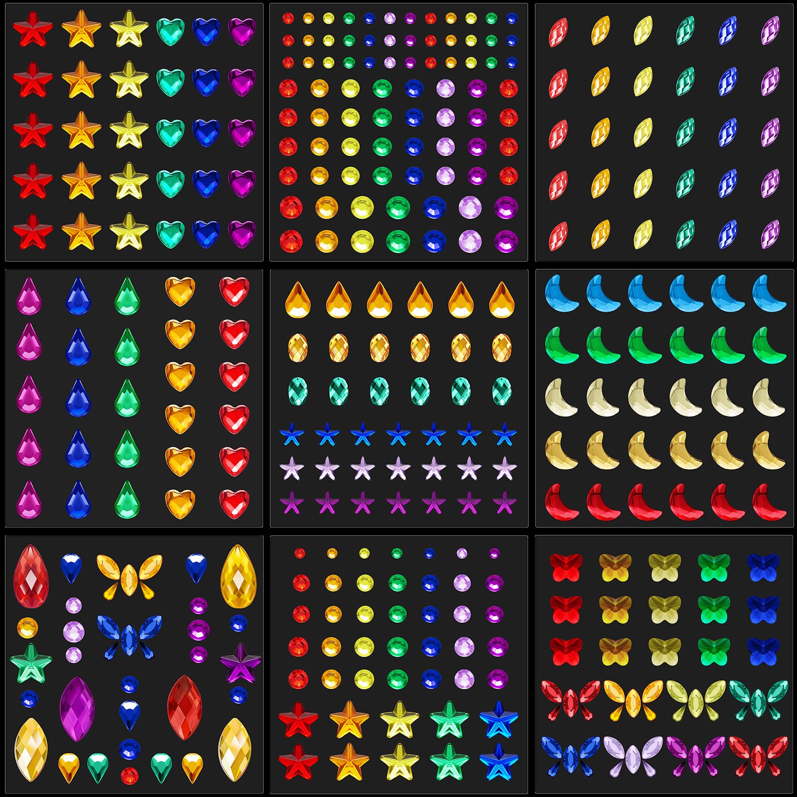Not just for once use: rhinestone stickers can be applied for several times, once the glue has been dried they can be applied again by using eyelash glue, which can enhance the stickiness. Use instruction: first you can clean the wanted paste place, then stripping decals and directly paste to your face or body, finally press face rhinestones to suit your face or body gently, you also can use eyelash glue to enhance the stickiness for avoiding fall off. Product material: our product is made of rhinestone and acrylic diamond, safe and stable, the face gems are also re-usable, clean them after your first time use, they can be applied again by using eyelash glue or body glue. Applicable occasions: the rhinestone stickers are suit for Christmas and Halloween festivals, you can paste them on your eyes, face, body or even your nail to catch eyes. Rhinestone stickers with various styles: there are 9 sheets eyes body face gems with various shapes provided for you to create distinctive patterns, a large quantity for you to use in various occasions.