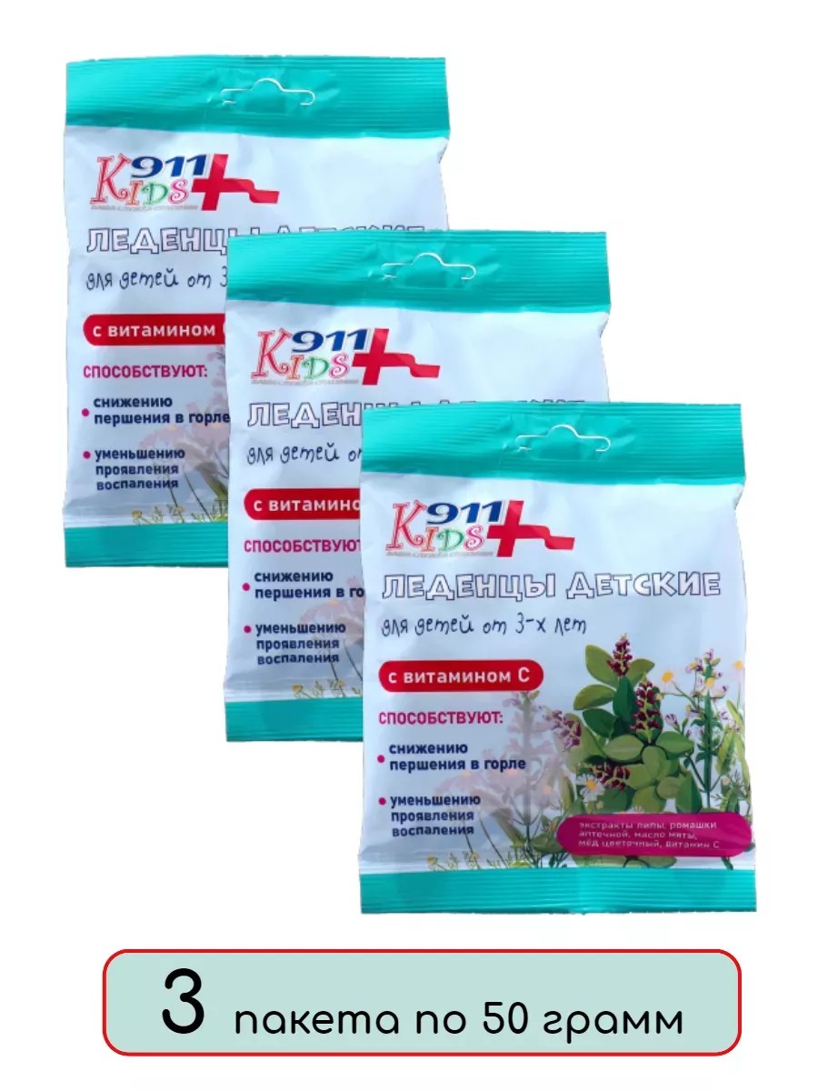 «911Kids Ваша служба спасения» леденцы детские с экстрактами липы, ромашки аптечной, мёдом и Витамином С способствуют уменьшению проявления воспаления, снижению першения в горле. Входящие в состав компоненты способствуют повышению иммунитета, снижают интенсивность сухого кашля.