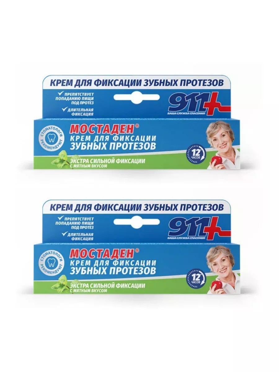 МОСТАДЕН 911 ваша служба спасения - крем для фиксации зубных протезов экстра сильной фиксации с мятным вкусом способствует надежной фиксации, предотвращая повреждение десен, не допускает смещения протеза, попадания под него частичек пищи.
