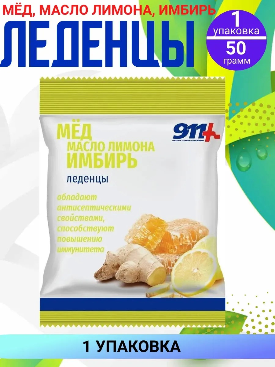 911 Леденцы мед масло лимона имбирь витамин C 50г для горла. Обладают антисептическими свойствами, способствуют повышению иммунитета. Содержание в рекомендованной дозе (5 шт леденцов): Витамин С 35 мг 58% от адекватного уровня потребления в сутки; пищевая ценность (на 100 г): белки 0 г, жиры 0 г, углеводы 97 г. Энергетическая ценность на 100 г: 1620 кДж/388 Ккал. Способ применения и дозы: Взрослым по 5 леденцов в течение дня непосредственно после приемов пищи, рассасывая во рту до полного растворения. Продолжительность приёма: 2 недели. При необходимости прием можно повторить. Состав: сахар, патока крахмальная, мед цветочный, лимонная кислота (антиокислитель), экстракт имбиря лекарственного, аскорбиновая кислота (витамин С - L-аскорбиновая кислота), эфирное масло лимона обыкновенного, эфирное масло лайма настоящего, каротины (80-94 мг/кг) (краситель). Противопоказания: индивидуальная непереносимость компонентов, беременность и кормление грудью, аллергические реакции на продукты пчеловодства, нарушение углеводного обмена. Перед применением рекомендуется проконсультироваться с врачом.