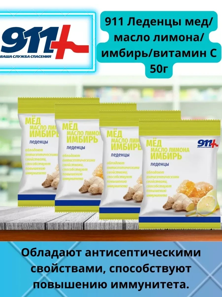 911 Ваша служба спасения 911 Леденцы мед-имбирь с витамином, , 2,5г 50 шт. -5 уп.