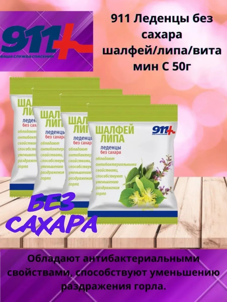 911 Sugar-Free Lozenges, Sage, Linden, Vitamin C, 50 g. Have antibacterial properties and help reduce throat irritation. Content in the recommended dose (5 lozenges): Vitamin C 35 mg, or 58% of the adequate daily intake; Essential oils 12.5 mg. Nutritional value (per 100 g): proteins 0 g, fats 0 g, carbohydrates 98 g (including sugar alcohols 97.7 g). Energy value per 100 g: 970 kJ/230 kcal. The daily intake of sugar alcohols is no more than 50 g. 100 g of the product contains 97.7 g of sugar alcohols, the daily dose of the product (5 lozenges of 2.5 g) - 12.2 g. DOSAGE AND ADMINISTRATION: Adults take 5 lozenges during the day immediately after meals, dissolving in the mouth until completely dissolved. Duration of admission is 2 weeks. If necessary, the intake can be repeated. CONTRAINDICATIONS: individual intolerance to the components, pregnancy and breastfeeding, tendency to intestinal disorders. It is recommended to consult a doctor before use. INGREDIENTS: isomalt (sweetener), maltitol syrup (sweetener), citric acid (antioxidant), sage extract, small-leaved linden extract, ascorbic acid (vitamin C - L-ascorbic acid), color: copper complexes of chlorophyllins, curcumin. Contains sweeteners. May have a laxative effect if consumed in excess.