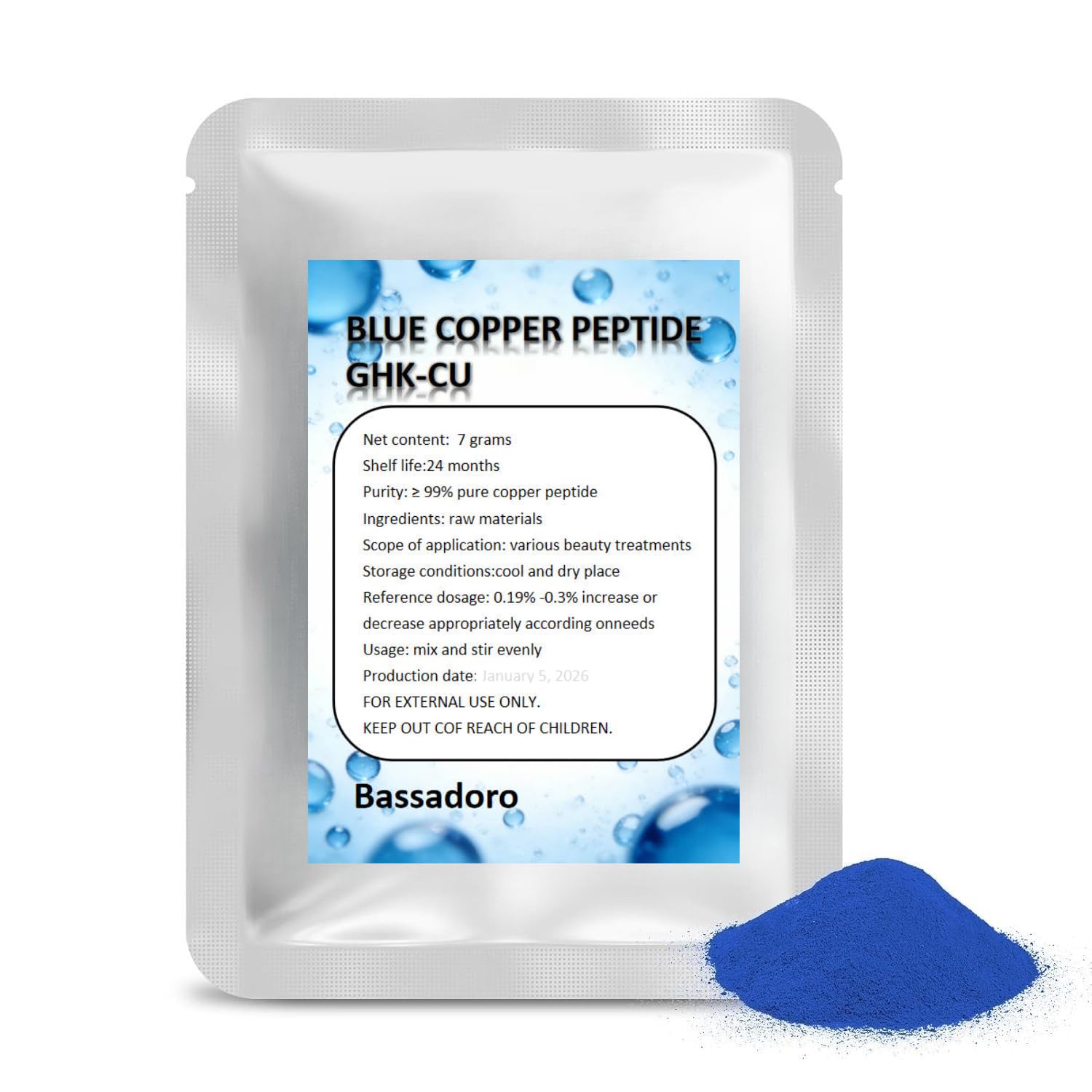 Description: GHK-Cu is a classic, effective copper peptide naturally found in human skin. It deeply nourishes skin, boosts collagen to firm texture and fade fine lines for a youthful, tight look. It also gently strengthens the skin barrier, soothes redness, fights free radicals against photoaging, leaving skin bright, clear and healthy. Basic Specifications Wet Weight: 7 Gram Btl Solubility: Water Soluble Purity: =99 Water(k.F.): =5 Suggested Applications: Skin Hair Care Products Storage Requirements Protected from direct light and humidity, store at 50 -77 F (10 -25 C) 12-month shelf life when properly stored in a sealed container. Usage Reminder Add to your formulation strictly at the recommended usage rate for optimal results. Package Includes: 7g GHK-Cu Copper Peptide Important Usage Notes Cosmetic grade only, for external use only Suitable for cosmetic personal care formulations (serums, creams, skincare products, etc.)Gentle Versatile Blends easily into serums creams eye creams (DIY pro use) lightweight residue-free, vegan cruelty-free, fits all skin types. Stable Premium Pure cobalt blue copper peptide, no additives, 12-month room temp stability, no refrigeration. Anti-Photoaging Resists UV photoaging, improves post-sun dullness roughness, evens tone, delays premature aging, maintains healthy texture. Barrier Soothe Scavenges free radicals inhibits inflammation, relieves redness, repairs barrier, reduces dry flakes, strengthens skin defense. Firming Lift 99.2 pure GHK-Cu boosts collagen, improves sagging dry fine lines, enhances firmness, fights aging for youthful contour.
