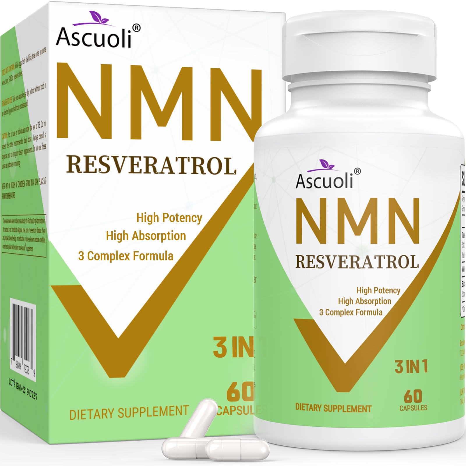 Safe Proven Ingredients The quality, safety, and efficacy were tested and passed 3rd Party Lab Tests. And Ascuoli NMN Resveratrol comes in a completely shelf-stable non-refrigerated form, the unique enteric capsule to highly reduce unnecessary component loss and ensure maximum absorption of NMN and Resveratrol. A Simple Healthy Routine from Ascuoli NMN Resveratrol Ascuoli NMN Resveratrol supplement are simple addition to your health routine. Easily to carry chew, take one NMN Resveratrol lozenge daily, help you health sustains highest levels of NAD , keep your body and your mind at PEAK condition. Ascuoli nmn Trans-Resveratrol provide you with the BEST aging supplement. 99 Purity Trans-Resveratrol Ascuoli Trans-Resveratrol is not a diluted plant extract found in other resveratrol products on the market. It increases the activity of the sirtuins–SIRT1 and SIRT3, in particular. In some study, Trans-Resveratrol was shown to be the most potent natural activator of the sirtuins proteins. It has a positive effect on all three major longevity pathways. 3-IN-1 Powerful Combination for Maximum Results! Ascuoli NMN 500mg Trans-Resveratrol 600mg Black pepper extract 50mg: As we age, NAD levels fall, NMN helps boost NAD levels to slow the aging process, repair DNA and generate cell energy. Trans-resveratrol is a proven antioxidant supplement that promotes anti-aging. Black pepper extract can greatly increase bioavailability and absorption of the ingredients. Stack 3 ingredients together for max healthy aging support. 2025 New Advanced Formula Ascuoli NMN 500mg Trans-Resveratrol 600mg Supplement - 1150mg per serving 60 Capsules per bottle 30 Days serving supply. 1150mg NMN Resveratrol - For Boost NAD, Cell Repair , Immune, Energy Muscle, Anti-Aging, the powerful antioxidant. Ascuoli 99 pure NMN Resveratrol Capsule ensure you will get the Max support to reduce the signs of Aging.