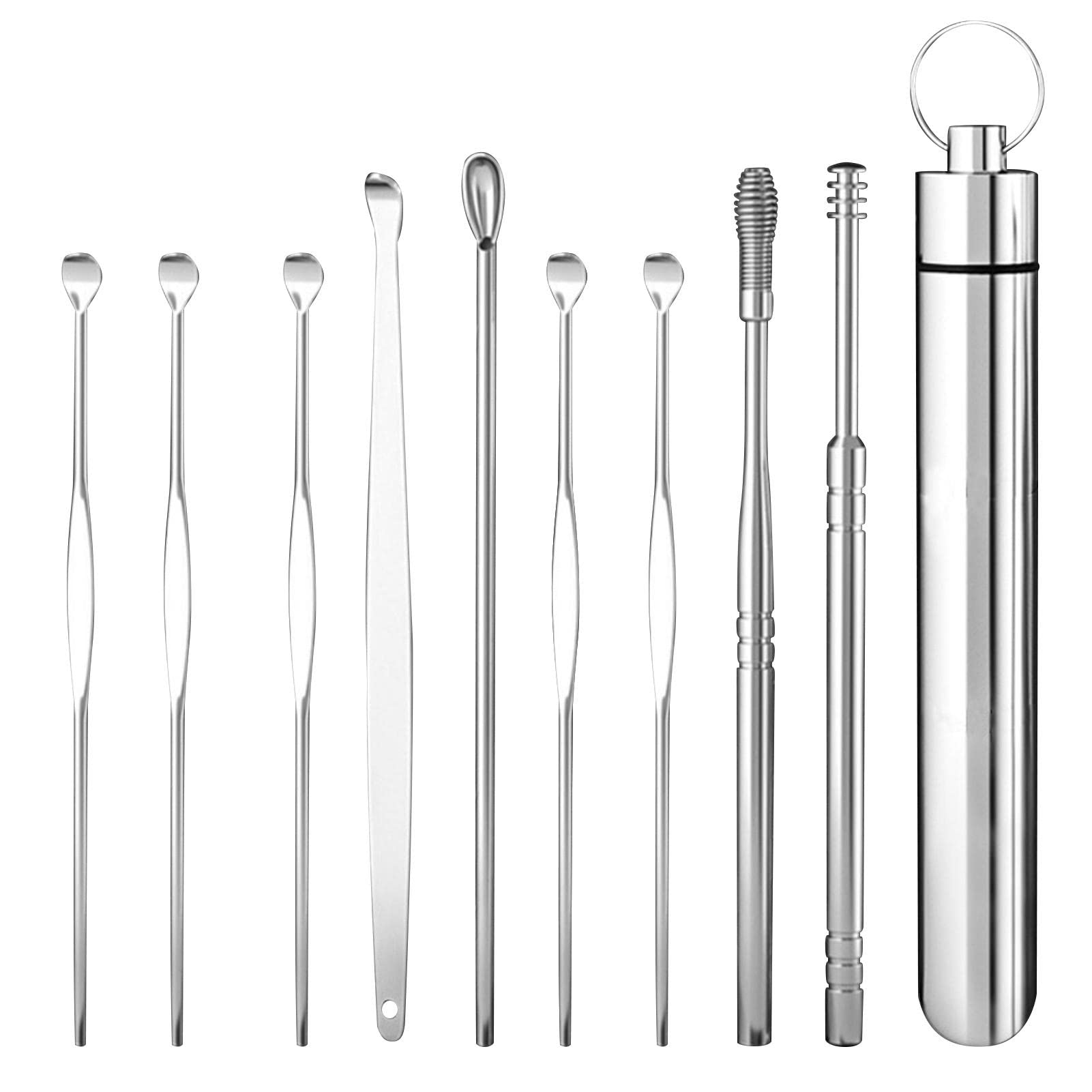 9pcs Ear Picks with Carrying Case Stainless Steel Adults Kids Reusable Smooth Earwax Removal Kit Travel Home(Silver)