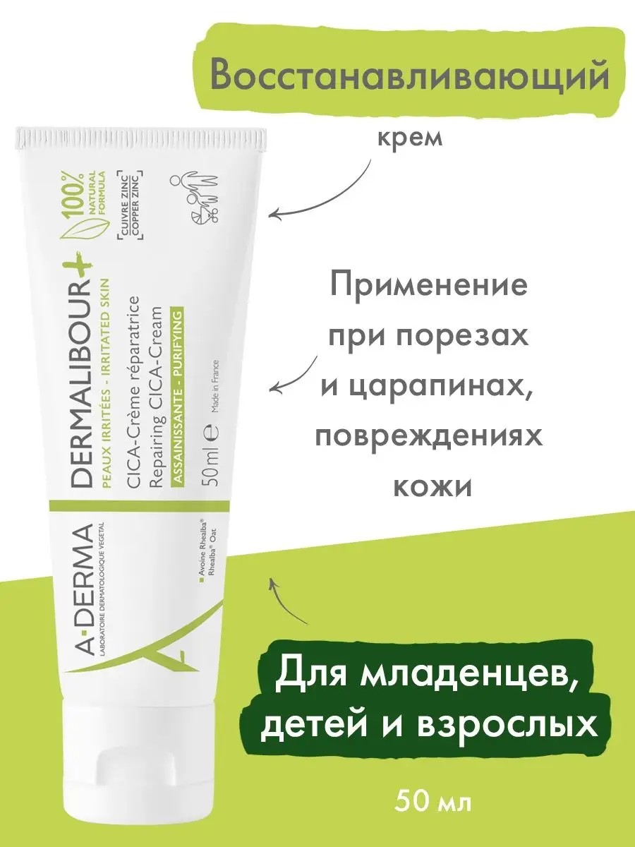 Восстанавливающий крем для тела и лица DERMALIBOUR +, CICA-Creme, 50 мл. Восстанавливающий заживляющий крем A-Derma Dermalibour+ (А-Дерма Дермалибур+) - универсальное средство для всех членов семьи, в том числе младенцев. Он устраняет множество видов повреждений кожи и слизистой оболочки: покраснения, трещинки в уголках губ, шелушение, ожоги, порезы, царапины, ягодичную эритему. Крем подходит для лица, тела и наружных слизистых оболочек, он дарит комфорт и устраняет неприятные ощущения уже после первого применения. В основе формулы лежит уникальный экстракт ростков овса Реальба, успокаивающий поврежденную кожу, а также сульфаты меди и цинка: они обладают антибактериальным действием и препятствуют распространению инфекции. Крем водоустойчив и гипоаллергенен, не содержит парабенов и отдушек, не оставляет белых следов. Активные компоненты: -экстракт ростков овса Реальба успокаивает, снимает раздражение, смягчает, увлажняет и заживляет кожу; -сульфаты меди и цинка уничтожают патогенную микрофлору и грибки, ускоряют заживление повреждений кожи. Линия A-DERMA DERMALIBOR+ ВОССТАНАВЛИВАЮЩИЙ КРЕМ - для раздраженной кожи всех типов, в том числе и чувствительной. АКТИВНЫЕ ИНГРЕДИЕНТЫ: экстракт ростков овса Rhealba успокаивает, восстанавливает кожный баланс; медь и цинк обладают дезинфицирующим действием, предупреждают размножение бактерий. A-Derma Dermalibour+ CICA-Creme reparatrice assainissante (А-Дерма Дермалибур+ Цика Крем восстанавливающий) -восстанавливающий крем. При раздражении кожи рук, кожи вокруг рта, при склонности кожи к шелушению, опрелостях, раздражении при грудном вскармливании. Разработан с использованием комбинации меди и цинка и экстракта ростков Овса Реальба, который мгновенно успокаивает и способствует быстрому восстановлению кожи. Увлажняющая и питательная основа обеспечивает оптимальный комфорт. Без ароматизаторов.