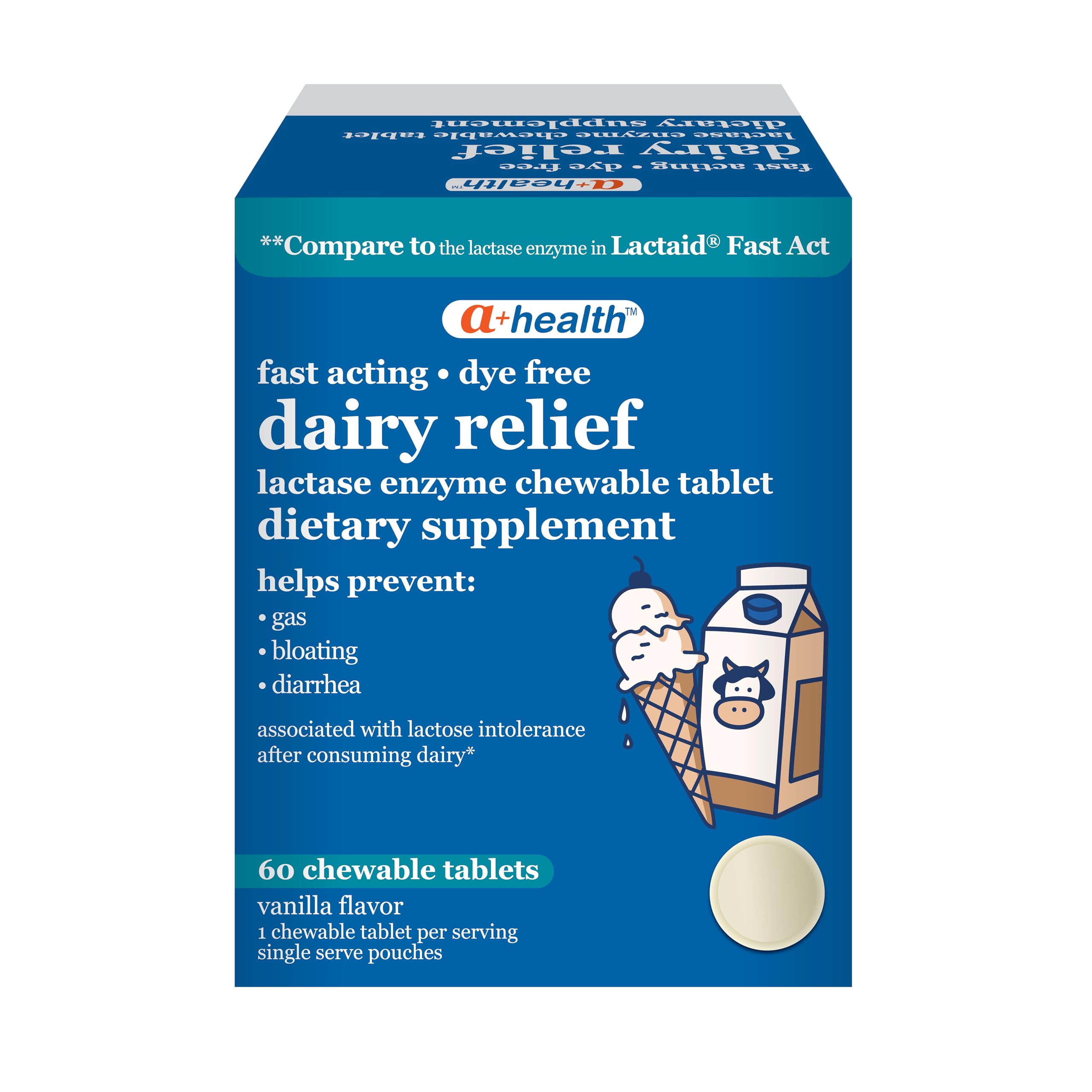 A Health Dairy Relief Lactase Enzyme 9000 FCC Chewable Tablets are fast-acting and dye free. Compare to the lactase enzyme in Lactaid Fast Act. The product helps to prevent symptoms such as gas, bloating and diarrhea associated with lactose intolerance after consuming dairy. It helps to prevent the symptoms by breaking down the milk sugar (lactose) and making dairy foods easier to digest. This product is a dietary supplement, NOT A DRUG. It contains a natural lactase enzyme and may be used by adults and children 4 years and over. This product may be used with every meal or snack containing dairy. Each box includes 60 single serve pouches with chewable tablets in a delicious vanilla flavor.