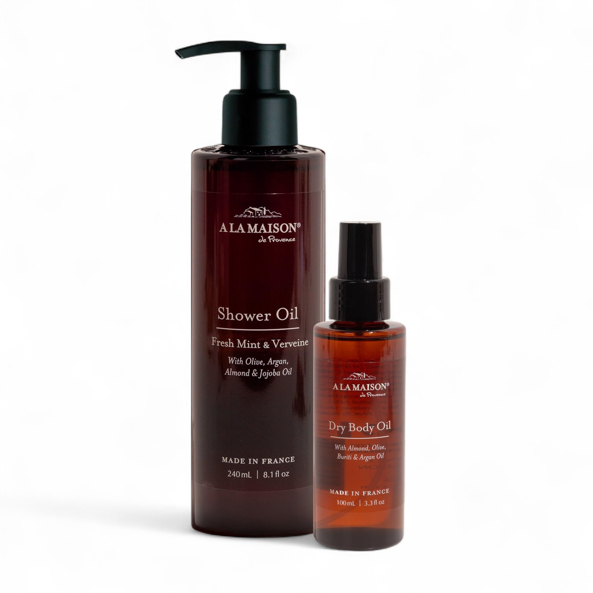 A LA MAISON Amber Collection Fresh Mint & Verveine Duo: Shower Oil - 3.3 oz Moisturizing & Fast-Absorbing Body Oil 8.1 oz Hydrating Body Wash Alternative