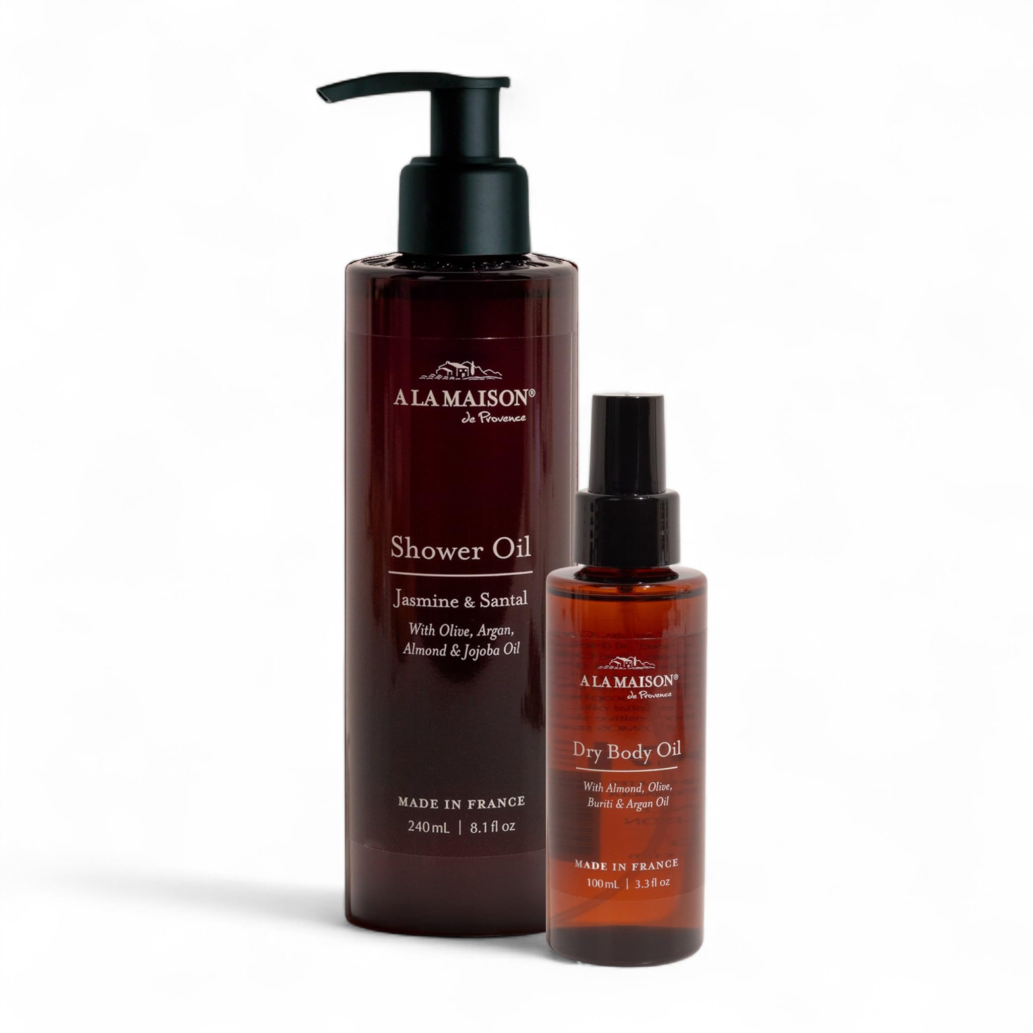 A LA MAISON Amber Collection Jasmine Santal Duo: Shower Oil - 3.3 oz Moisturizing Fast-Absorbing Body Oil, 8.1 oz Hydrating Body Wash Alternative