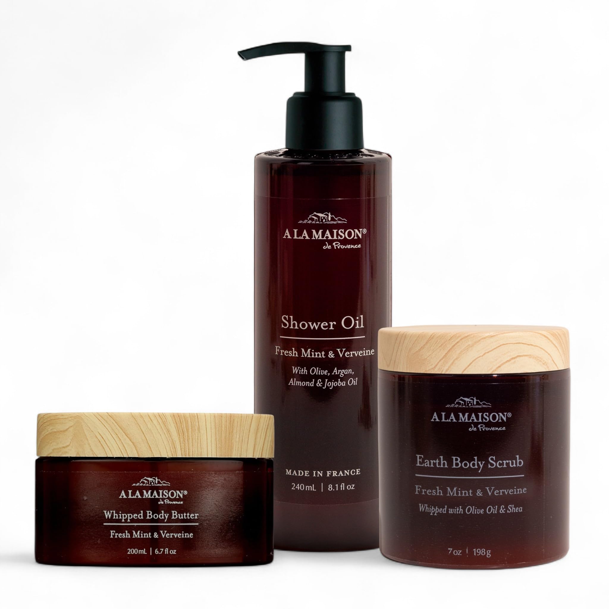 A La Maison Amber Collection Starter Kit - Shower Oil + Body Scrub + Body Butter Fresh Mint & Verveine Gently Exfoliates & Softens Skin French Formula Plant-Based